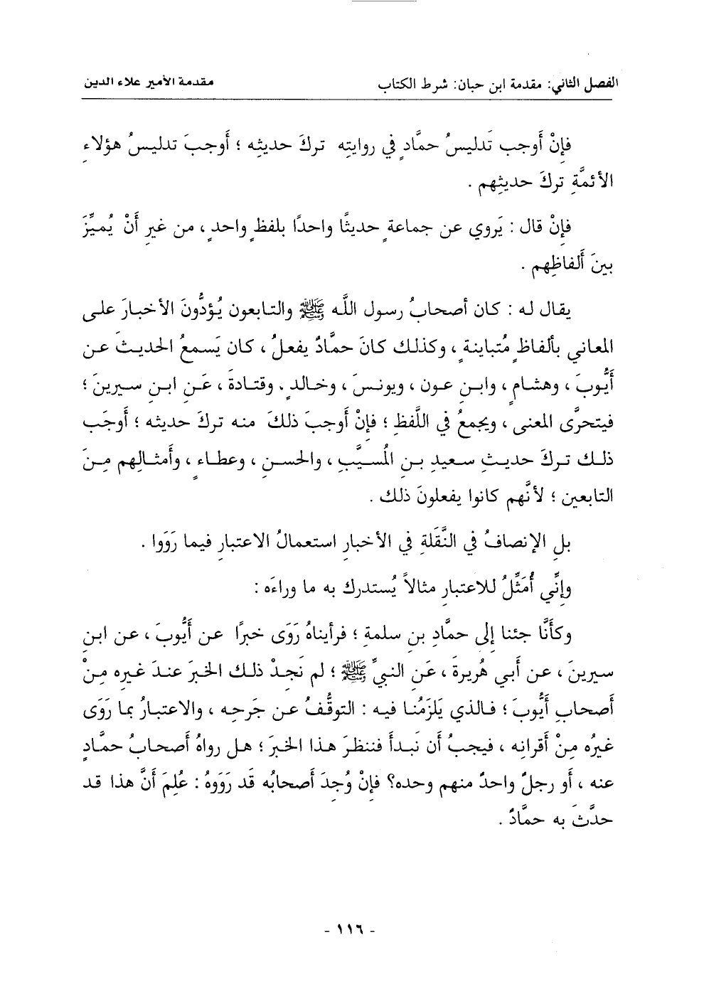 وكأنا جئنا إلى حماد بن سلمة فرأيناه روى خبراً عن أيوب عن ابن سيرين عن أبي هريرة عن النبي صلى الله عليه وسلم لم نجد ذلك الخبر عند غيره من أصحاب أيوب فالذي يَلزَمُنا فيه التوقف عن جرحه والاعتبار بما روى غيره من أقرانه فيجب أن نبدأ فننظر هذا الخبر هل رواه أصحاب حماد عنه أو رجل واحد منهم وحده؟ فإن وُجِدَ أصحابه قد رَوَوهُ عُلِمَ أن هذا قد حدَّثَ به حمادٌ.