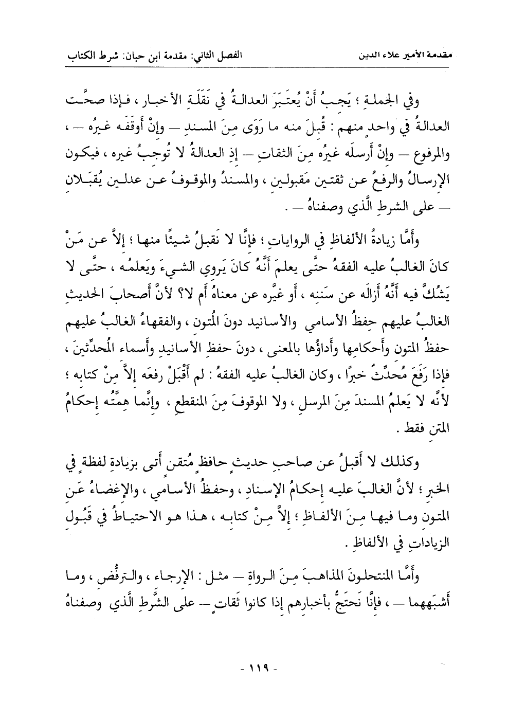 وفي الجملة يجب أن يعتبر العدالة في نَقَلَةِ الأخبار فإذا صحت العدالة في واحد منهم قُبِلَ منه ما روى من المسند ـ وإن أوقفه غيره ـ والمرفوع ـ وإن أرسله غيره من الثقات ـ إذ العدالة لا توجب غيره فيكون الإرسال والرفع عن ثقتين مقبولين والمسند والموقوف عن عدلين يقبلان ـ على الشرط الذي وصفناه ـ.