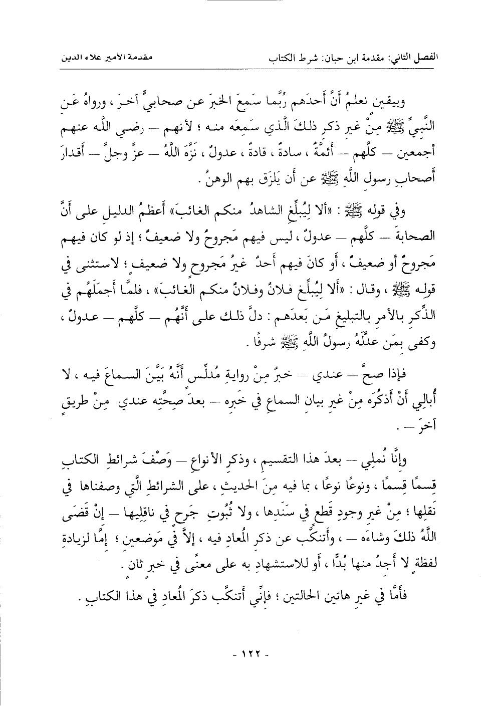 وإنا نملي ـ بعد هذا التقسيم وذكر الأنواع ـ وصف شرائط الكتاب قِسماً قِسماً ونوعاً نوعاً بما فيه من الحديث على الشرائط التي وصفناها في نقلها من غير وجود قطعٍ في سندها ولا ثُبُوت جرح في ناقليها ـ إن قضى الله ذلك وشاءه ـ وأتنكَّب عن ذكر المعاد فيه إلا في موضعين إما لزيادة لفظة لا أجد منها بُدًّا أو للاستشهاد به على معنى في خبر ثان.
