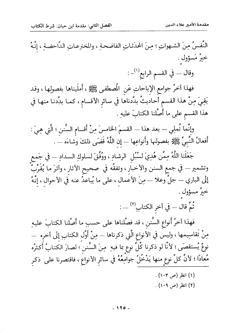 فهذا آخر أنواع السنن قد فصَّلناها على حسب ما أصَّلنا الكتاب عليه من تقاسيمها وليس في الأنواع التي ذكرناها ـ من أول الكتاب إلى آخره ـ نوع يُستقصى لأنا لو ذكرنا كل نوع بما فيه من السنن لصار الكتاب أكثرُه معاداً لأن كل نوع منها يدخل جوامِعُهُ في سائر الأنواع فاقتصرنا على ذكر