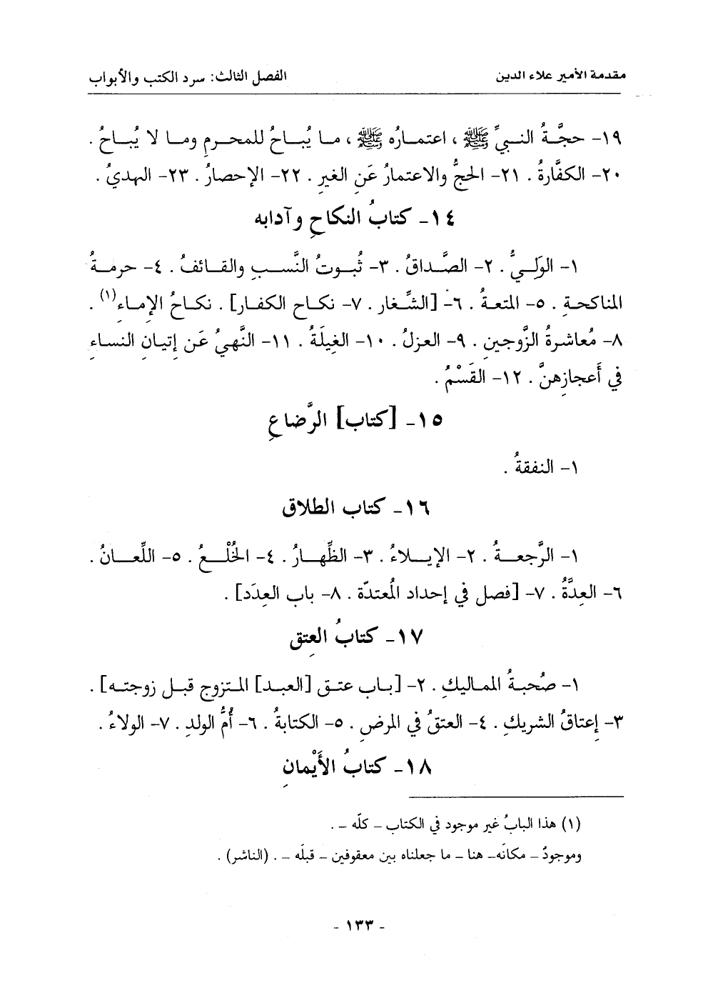 1 ـ الرجعة. 2 ـ الإيلاء. 3 ـ الظِّهار. 4 ـ الخلع. 5 ـ اللِّعان. 6 ـ العِدَّة. 7 ـ فصل في إحداد المُعتدّة. 8 ـ باب العِدَد].