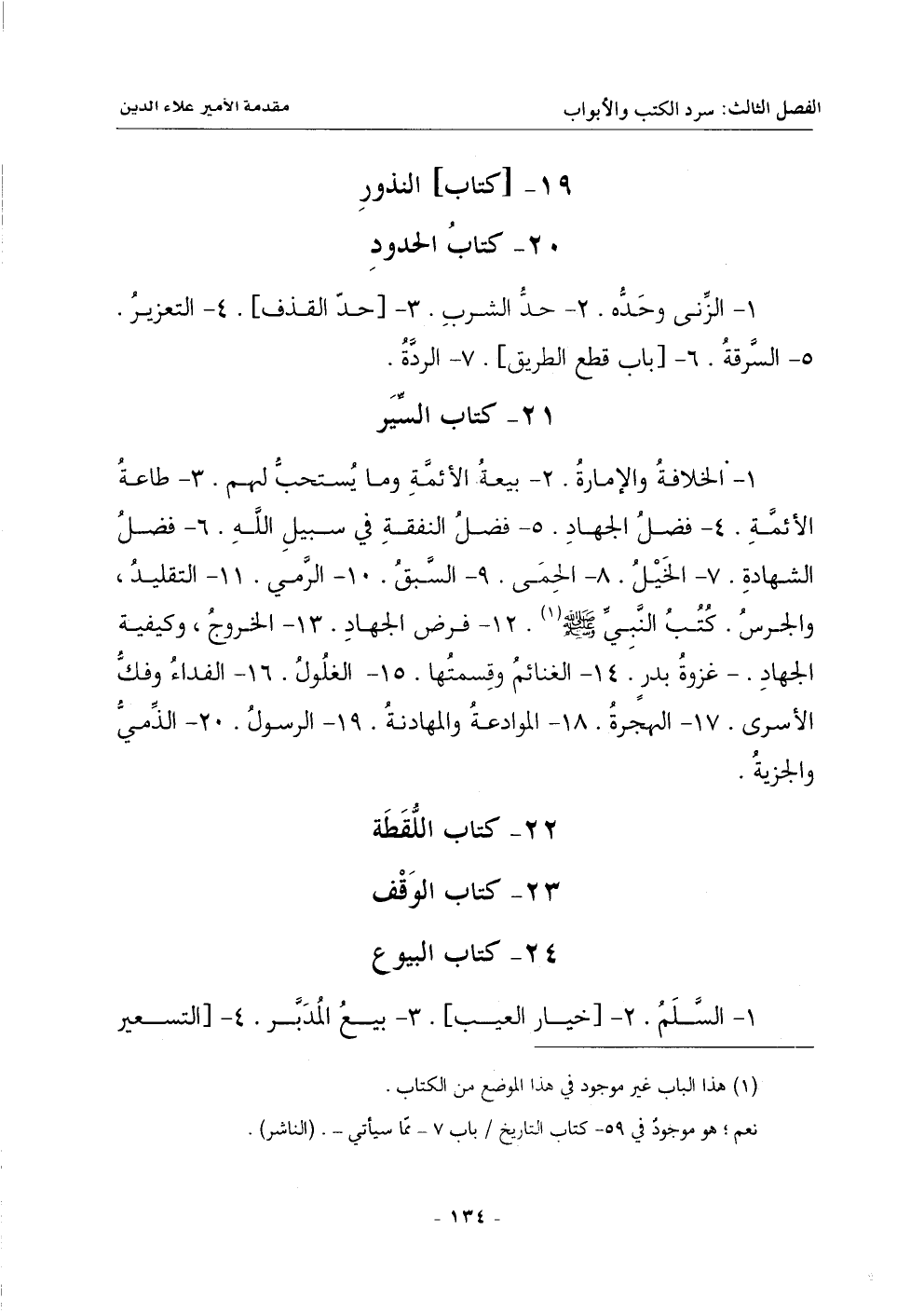 1 ـ الخلافة والإمارة. 2 ـ بيعة الأئمة وما يُستحبُّ لهم. 3 ـ طاعة الأئمة. 4 ـ فضل الجهاد. 5 ـ فضل النفقة في سبيل الله. 6 ـ فضل الشهادة. 7 ـ الخيل. 8 ـ الحِمَى. 9 ـ السَّبقُ. 10 ـ الرَّمي. 11 ـ التقليد , والجرسُ. كُتُبُ النبي صلى الله عليه وسلم (1). 12 ـ فرض الجهاد. 13 ـ الخروج وكيفية الجهاد. ـ غزوة بدر. 14 ـ الغنائم وقِسمتُها. 15 ـ الغلُولُ. 16 ـ الفداء وفك الأسرى. 17 ـ الهجرة. 18 ـ الموادعة والمهادنة. 19 ـ الرسول. 20 ـ الذِّميُّ والجزية