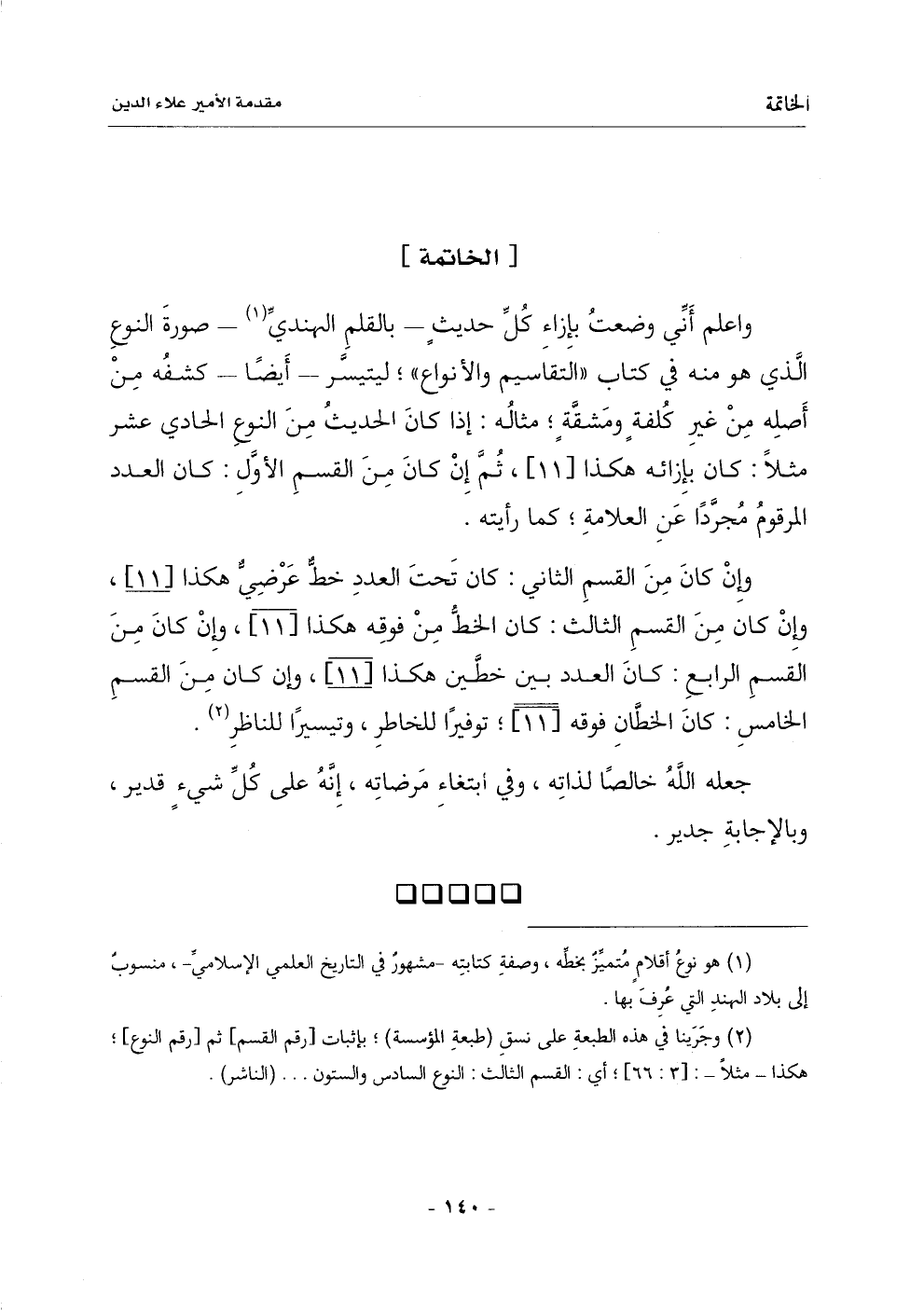 واعلم أني وضعتُ بإزاء كل حديث ـ بالقلم الهندي (1) ـ صورة النوع الذي هو منه في كتاب ((التقاسيم والأنواع)) ليتيسر ـ أيضاً ـ كشفه من أصله من غير كُلفة ومَشقَّةٍ: مثاله إذا كان الحديث من النوع الحادي عشر مثلاً: كان بإزائه هكذا [11] ثم إن كان من القسم الأوَّل: كان العدد المرقوم مجرداً عن العلامة؛ كما رأيته.