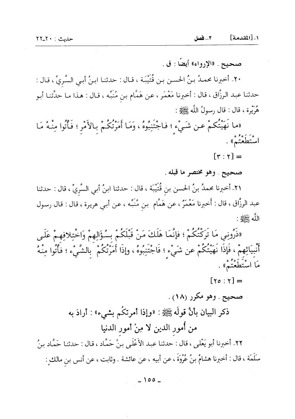 20 - أَخْبَرَنَا مُحَمَّدُ بْنُ الْحَسَنِ بْنِ قُتَيْبَةَ قَالَ: حَدَّثَنَا ابْنُ أَبِي السَّرِيِّ قَالَ: حَدَّثَنَا عَبْدُ الرَّزَّاقِ قَالَ: أَخْبَرَنَا مَعْمَرٌ عَنْ هَمَّامِ بْنِ مُنَبِّهٍ قَالَ: هَذَا مَا حَدَّثَنَا أَبُو هُرَيْرَةَ قَالَ: قَالَ رَسُولُ اللَّهِ صَلَّى اللَّهُ عَلَيْهِ وَسَلَّمَ: