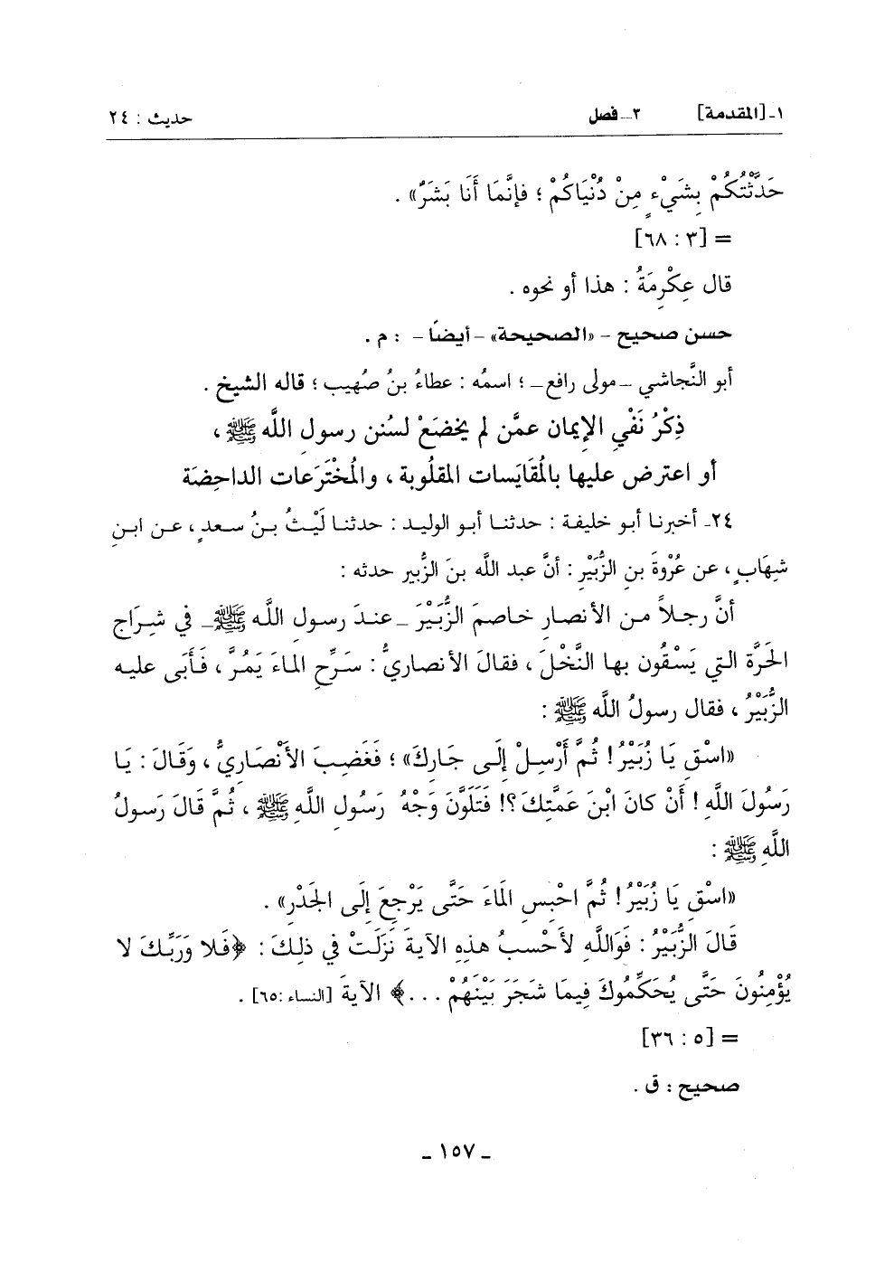اسْقِ يَا زُبَيْرُ ثُمَّ أَرْسِلْ إِلَى جَارِكَ فَغَضِبَ الْأَنْصَارِيُّ وَقَالَ: يَا رَسُولَ اللَّهِ أَنْ كَانَ ابْنَ عَمَّتِكَ؟ فَتَلَوَّنَ وَجْهُ رَسُولِ اللَّهِ صَلَّى اللَّهُ عَلَيْهِ وَسَلَّمَ ثُمَّ قَالَ رَسُولُ اللَّهِ صَلَّى اللَّهُ عَلَيْهِ وَسَلَّمَ