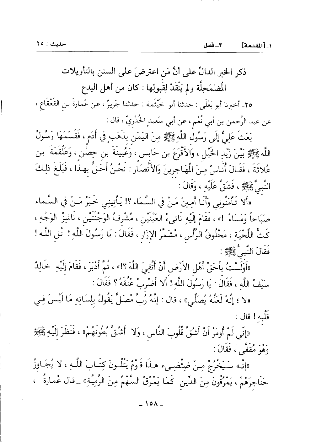 (إِنَّهُ سيخرج من ضئضىء هَذَا قَوْمٌ يَتْلُونَ كِتَابَ اللَّهِ لَا يُجَاوِزُ حَنَاجِرَهُمْ يَمْرُقُونَ مِنَ الدِّينِ كَمَا يَمْرُقُ السَّهْمُ مِنَ الرَّمِيَّةِ) قَالَ عُمَارَةُ: -[159]- فَحَسِبْتُ أَنَّهُ قَالَ: