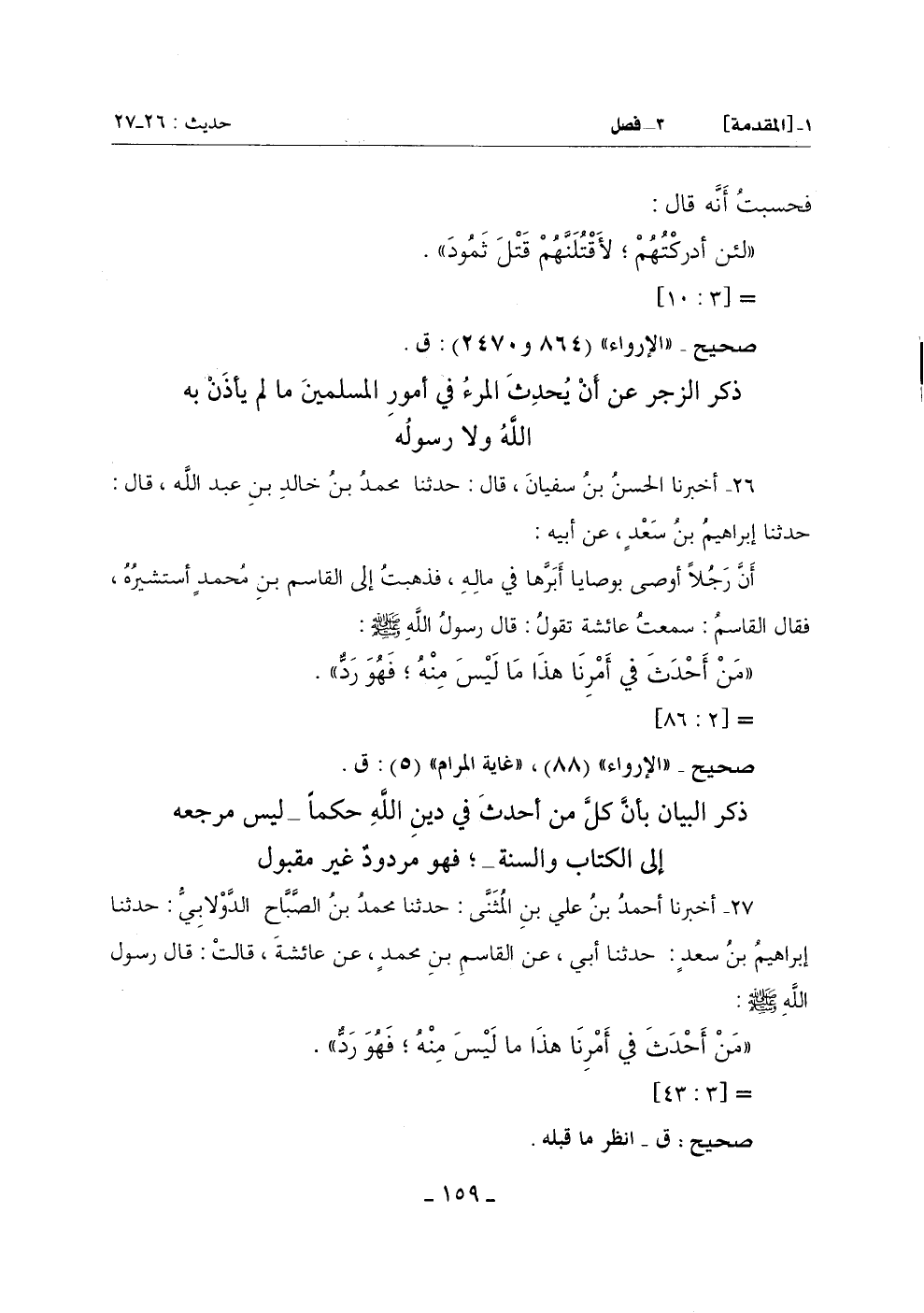 ذِكْرُ الْبَيَانِ بِأَنَّ كُلَّ مَنْ أَحْدَثَ فِي دِينِ اللَّهِ حُكْمًا لَيْسَ مَرْجِعُهُ إِلَى الْكِتَابِ وَالسُّنَّةِ فَهُوَ مَرْدُودٌ غَيْرُ مَقْبُولٍ