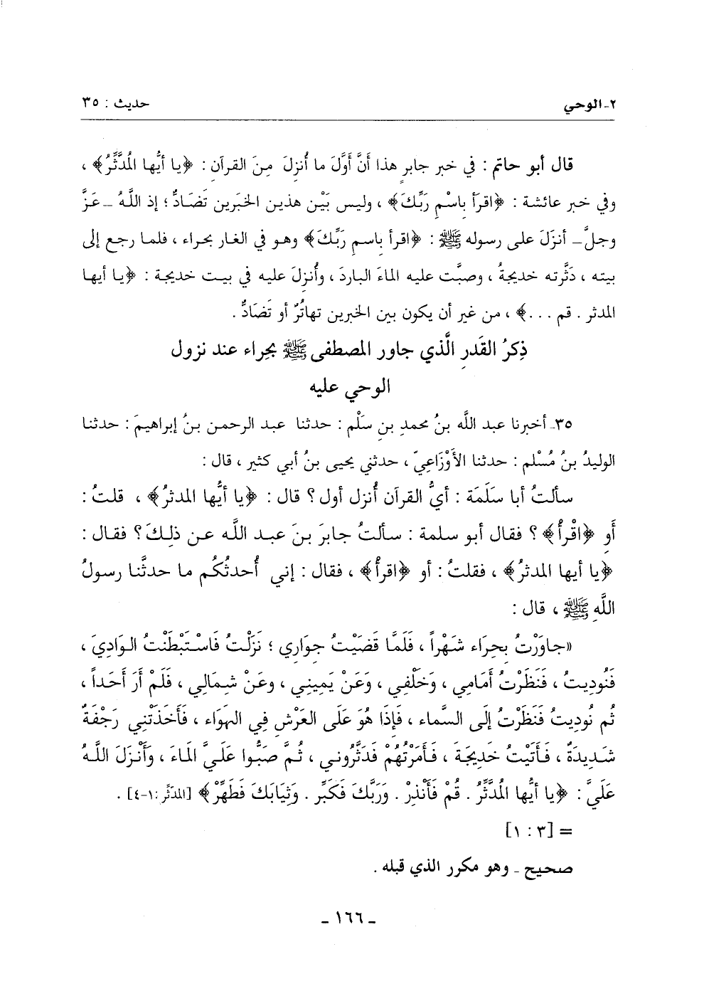 سَأَلْتُ أَبَا سَلَمَةَ: أَيُّ الْقُرْآنِ أُنزل أَوَّلَ؟ قَالَ: {يَا أَيُّهَا الْمُدَّثِّرُ} قلت: أوِ {اقرأ} فَقَالَ: أَبُو سَلَمَةَ: سَأَلْتُ جَابِرَ بْنَ عَبْدِ اللَّهِ عَنْ ذَلِكَ فَقَالَ: {يَا أَيُّهَا الْمُدَّثِّرُ} فقلت: أوِ {اقرأ} فَقَالَ: إِنِّي أُحَدِّثُكُمْ مَا حَدَّثَنَا رَسُولُ اللَّهِ صَلَّى اللَّهُ عَلَيْهِ وَسَلَّمَ قَالَ: