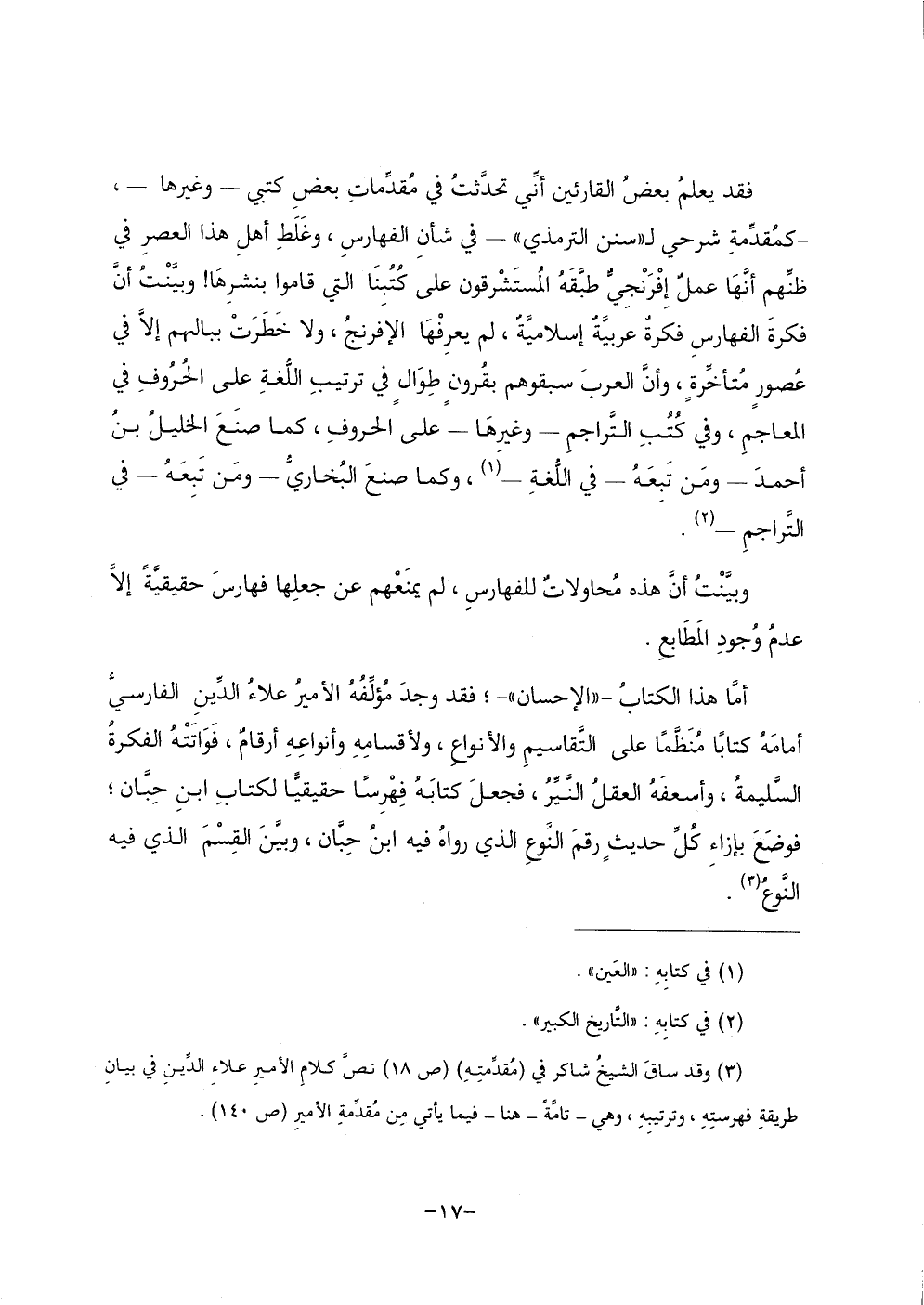 (3) وقد ساق الشيخ أحمد شاكر في مقدمته (ص18) نص كلام الأمير علاء الدين في بيان طريقة فهرسته، وترتيبه، وهي ـ تامة ـ هنا ـ فيما يأتي من مقدمة الأمير (ص140)