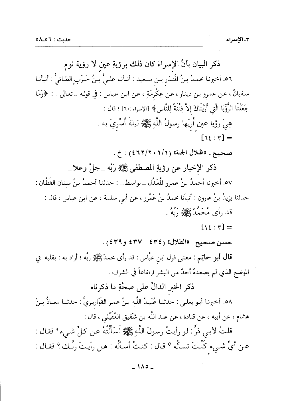 قَالَ أَبُو حَاتِمٍ: مَعْنَى قَوْلِ ابْنِ عَبَّاسٍ: (قَدْ رَأَى مُحَمَّدٌ صَلَّى اللَّهُ عَلَيْهِ وَسَلَّمَ رَبَّهُ) أَرَادَ بِهِ بِقَلْبِهِ فِي الْمَوْضِعِ الَّذِي لَمْ يَصْعَدْهُ أَحَدٌ مِنَ الْبَشَرِ ارْتِفَاعًا فِي الشرف.