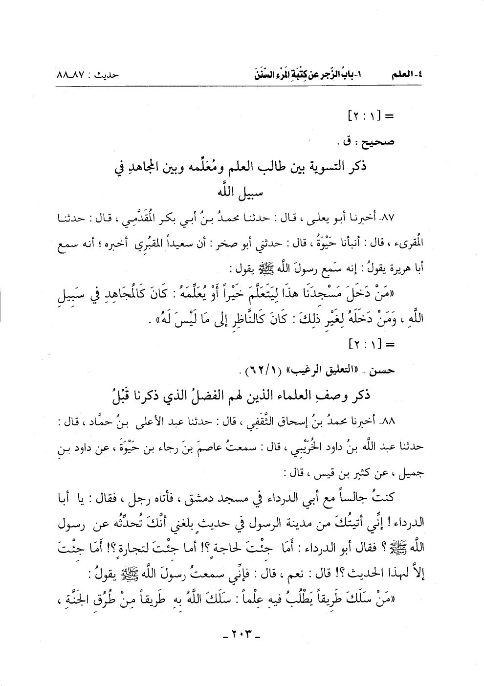 (مَنْ سَلَكَ طَرِيقًا يَطْلُبُ فِيهِ عِلْمًا سَلَكَ اللَّهُ بِهِ طَرِيقًا مِنْ طُرُقِ الْجَنَّةِ -[204]- وَالْمَلَائِكَةُ تَضَعُ أَجْنِحَتَهَا رِضًا لِطَالِبِ الْعِلْمِ وَإِنَّ الْعَالِمَ يَسْتَغْفِرُ لَهُ مَنْ فِي السَّمَاوَاتِ وَمَنْ فِي الْأَرْضِ وَالْحِيتَانُ فِي الْمَاءِ وَفَضْلُ الْعَالِمِ عَلَى الْعَابِدِ كَفَضْلِ الْقَمَرِ لَيْلَةَ الْبَدْرِ عَلَى سَائِرِ الْكَوَاكِبِ إِنَّ الْعُلَمَاءَ وَرَثَةُ الْأَنْبِيَاءِ إِنَّ الْأَنْبِيَاءَ لَمْ يُوَرِّثُوا دِينَارًا وَلَا دِرْهَمًا وَأَوْرَثُوا الْعِلْمَ فَمَنْ أَخَذَهُ أَخَذَ بِحَظٍّ وَافِرٍ)