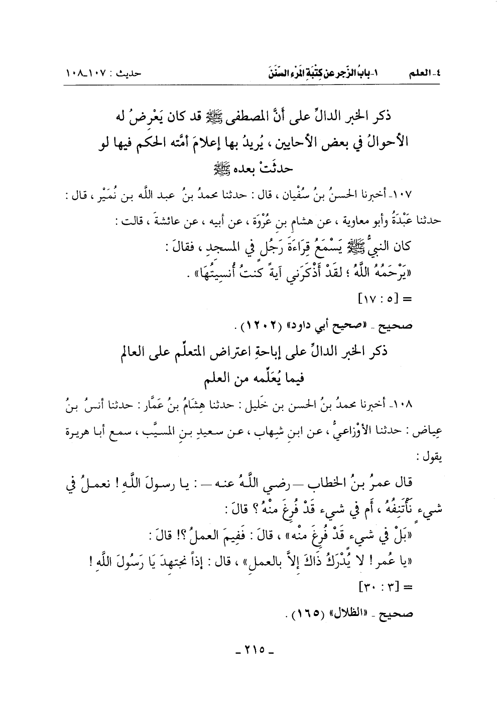 107 - أَخْبَرَنَا الْحَسَنُ بْنُ سُفْيَانَ قَالَ: حَدَّثَنَا مُحَمَّدُ بْنُ عَبْدِ اللَّهِ بْنِ نُمَيْرٍ قَالَ: حَدَّثَنَا عَبْدَةُ وَأَبُو مُعَاوِيَةَ عَنْ هِشَامِ بْنِ عُرْوَةَ عَنْ أَبِيهِ عَنْ عَائِشَةَ قَالَتْ: