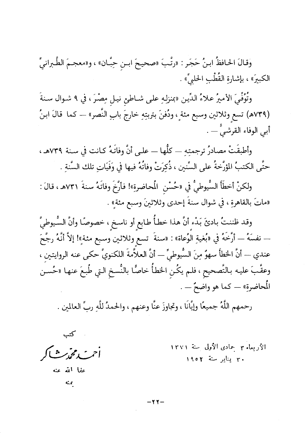 وقد ظننت بادئ بدء أن هذا خطأ طابع أو ناسخ، خصوصا وأن السيوطي ـ نفسه ـ أرَّخَهُ في ((بغية الوعاة)): ((سنة تسع وثلاثين وسبع مئة))! إلا أنه رجَّح عندي ـ أن الخطأ سهو من السيوطي ـ أن العلامة اللكنوي حكى عنه الروايتين، وعقَّبَ عليه بالتصحيح، فلم يكن الخطأ خاصًّا بالنسخ التي طبع عنها ((حُسن المحاضرة)) ـ كما هو واضح ـ.