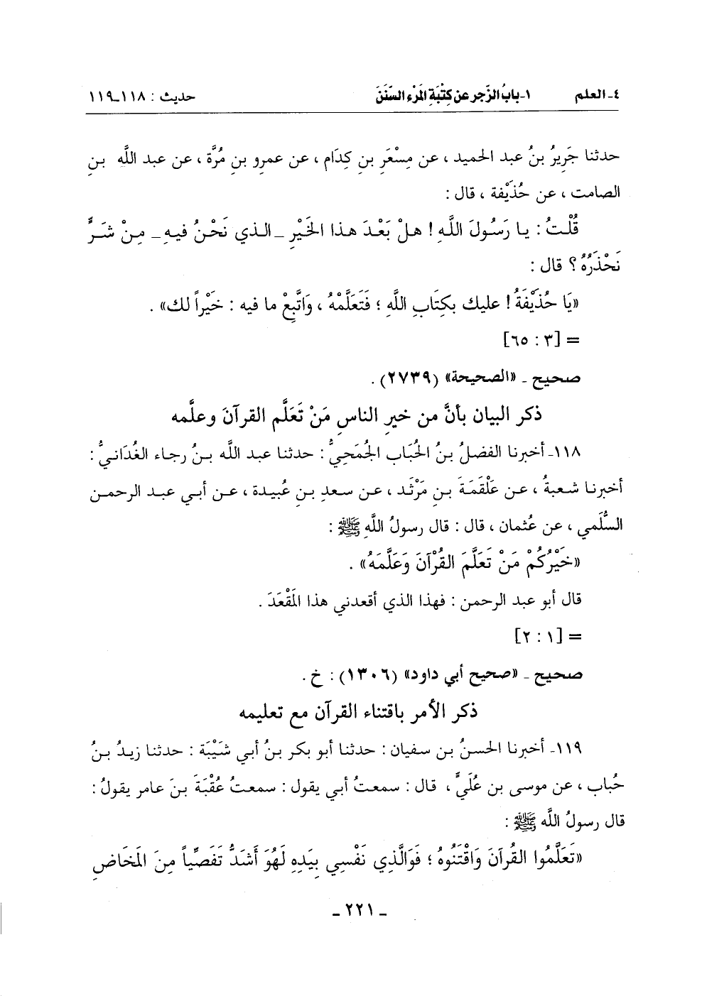 118 - أَخْبَرَنَا الْفَضْلُ بْنُ الْحُبَابِ الْجُمَحِيُّ حَدَّثَنَا عَبْدُ اللَّهِ بْنُ رَجَاءٍ الْغُدَانِيُّ أَخْبَرَنَا شُعْبَةُ عَنْ عَلْقَمَةَ بْنِ مَرْثَدٍ عَنْ سَعْدِ بْنِ عُبَيْدَةَ عَنْ أَبِي عَبْدِ الرَّحْمَنِ السُّلَمِيِّ عَنْ عُثْمَانَ قَالَ: قَالَ رَسُولُ اللَّهِ صَلَّى اللَّهُ عَلَيْهِ وَسَلَّمَ: