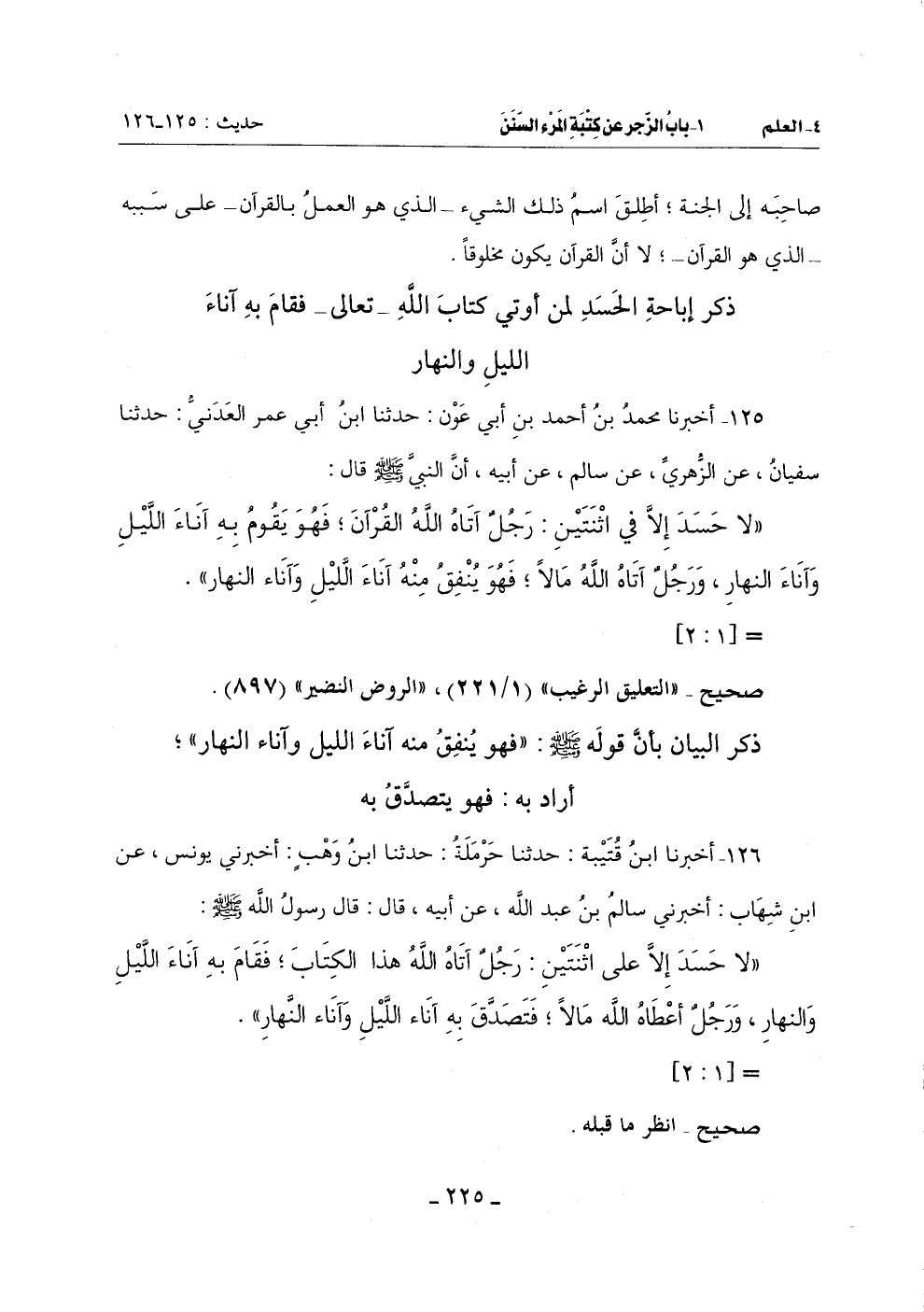 (لا حَسَدَ إِلَّا فِي اثْنَتَيْنِ: رَجُلٌ آتَاهُ اللَّهُ الْقُرْآنَ فَهُوَ يَقُومُ بِهِ آنَاءَ اللَّيْلِ وَآنَاءَ النَّهَارِ وَرَجُلٌ آتَاهُ اللَّهُ مَالًا فَهُوَ يُنْفِقُ منه آناء الليل وآناء النهار)