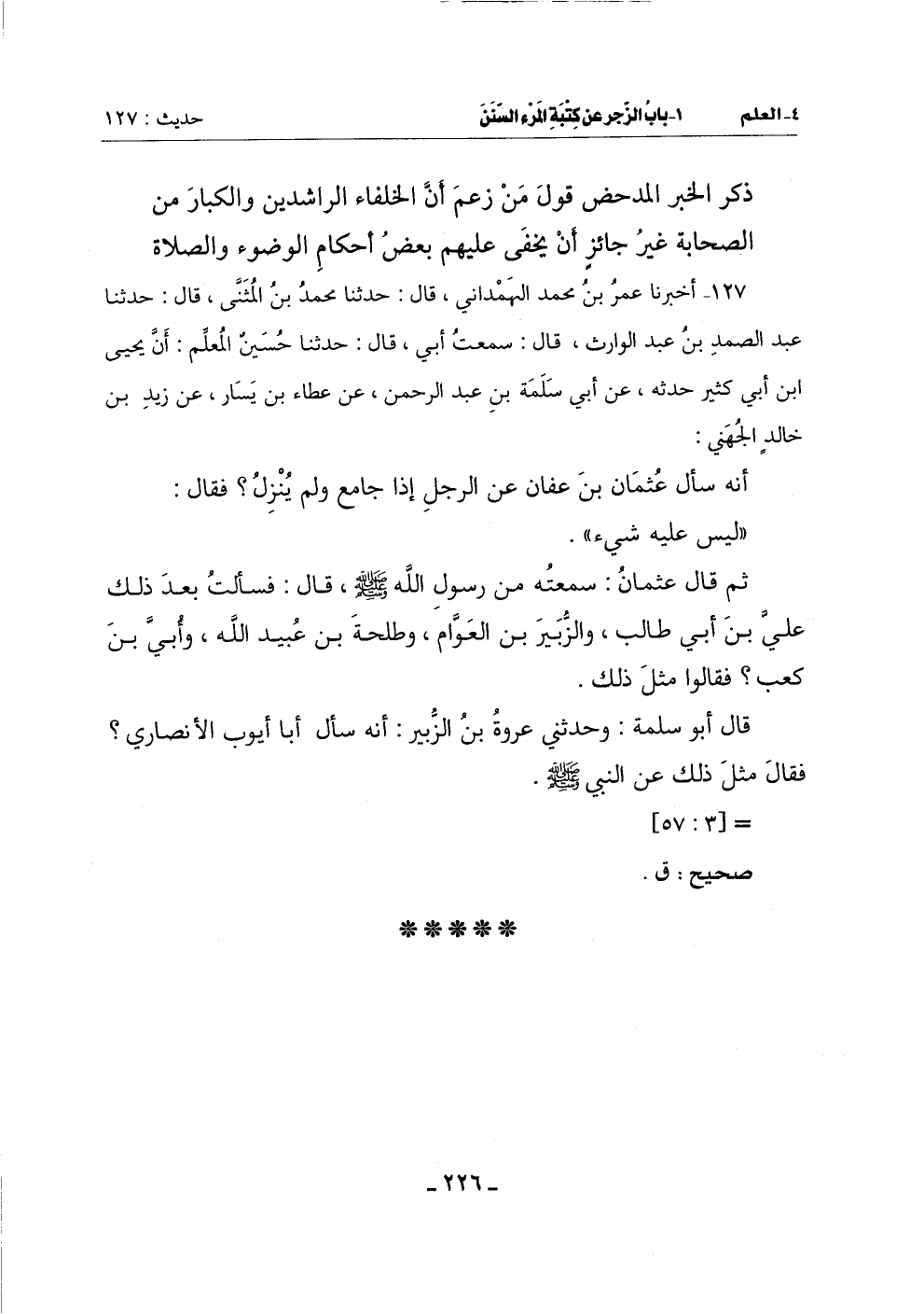 127 - أَخْبَرَنَا عُمَرُ بْنُ مُحَمَّدٍ الْهَمْدَانِيُّ قَالَ: حَدَّثَنَا مُحَمَّدُ بْنُ الْمُثَنَّى قَالَ: حَدَّثَنَا عَبْدُ الصَّمَدِ بْنُ عَبْدِ الْوَارِثِ قَالَ: سَمِعْتُ أَبِي قَالَ: حَدَّثَنَا حُسَيْنٌ الْمُعَلِّمُ: أَنَّ يَحْيَى بْنَ أَبِي كَثِيرٍ حَدَّثَهُ عَنْ أَبِي سَلَمَةَ بْنِ عَبْدِ الرَّحْمَنِ عَنْ عَطَاءِ بْنِ يَسَارٍ عَنْ زَيْدِ بْنِ خَالِدٍ الْجُهَنِيِّ: