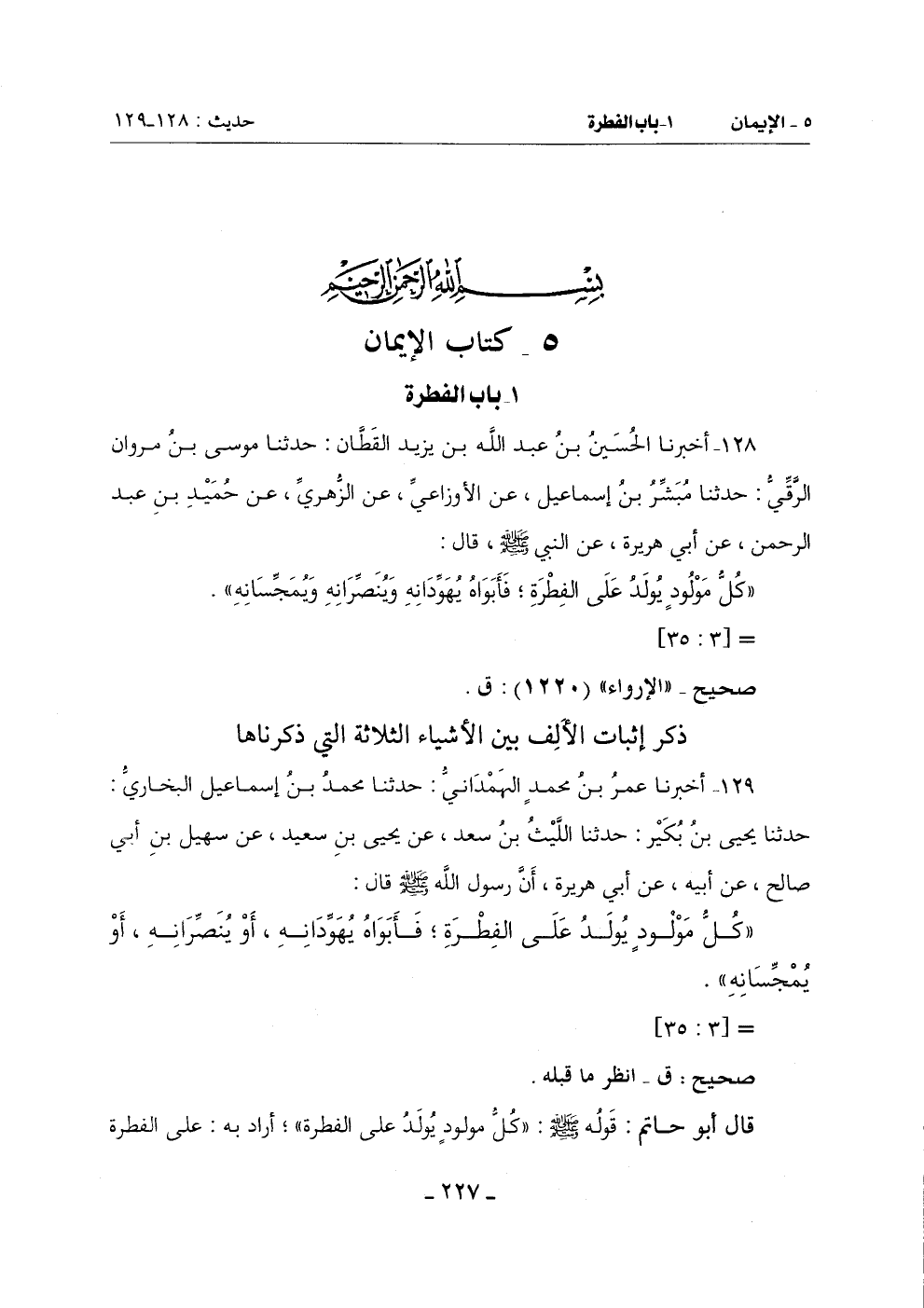 قَالَ أَبُو حَاتِمٍ قَوْلُهُ صَلَّى اللَّهُ عَلَيْهِ وَسَلَّمَ: (كُلُّ مَوْلُودٍ يُولَدُ عَلَى الْفِطْرَةِ) أَرَادَ بِهِ: عَلَى الْفِطْرَةِ -[228]- الَّتِي فَطَرَهُ اللَّهُ عَلَيْهَا جَلَّ وَعَلَا يَوْمَ أَخْرَجَهُمْ مِنْ صُلْبِ آدَمَ لِقَوْلِهِ جَلَّ وَعَلَا: {فِطْرَةَ اللَّهِ الَّتِي فَطَرَ النَّاسَ عَلَيْهَا لَا تَبْدِيلَ لِخَلْقِ اللَّهِ} [الروم: 30] يَقُولُ: لَا تَبْدِيلَ لِتِلْكَ الْخِلْقَةِ الَّتِي خَلَقَهُمْ لَهَا ـ إِمَّا لِجَنَّةٍ وَإِمَّا لِنَارٍ ـ حَيْثُ أَخْرَجَهُمْ مِنْ صُلْبِ آدَمَ فَقَالَ: هَؤُلَاءِ لِلْجَنَّةِ وَهَؤُلَاءِ لِلنَّارِ أَلَا تَرَى أَنَّ غُلَامَ الْخَضِرِ قَالَ صَلَّى اللَّهُ عَلَيْهِ وَسَلَّمَ: (طَبَعَهُ اللَّهُ يَوْمَ طَبَعَهُ كَافِرًا) وَهُوَ بَيْنَ أَبَوَيْنِ مُؤْمِنَيْنِ فَأَعْلَمَ اللَّهُ ذَلِكَ عَبْدَهُ الْخَضِرَ وَلَمْ يُعلم ذَلِكَ كَلِيمَهُ مُوسَى صَلَّى اللَّهُ عَلَيْهِ وَسَلَّمَ عَلَى مَا ذَكَرْنَا فِي غَيْرِ مَوْضِعٍ مِنْ كُتُبِنَا