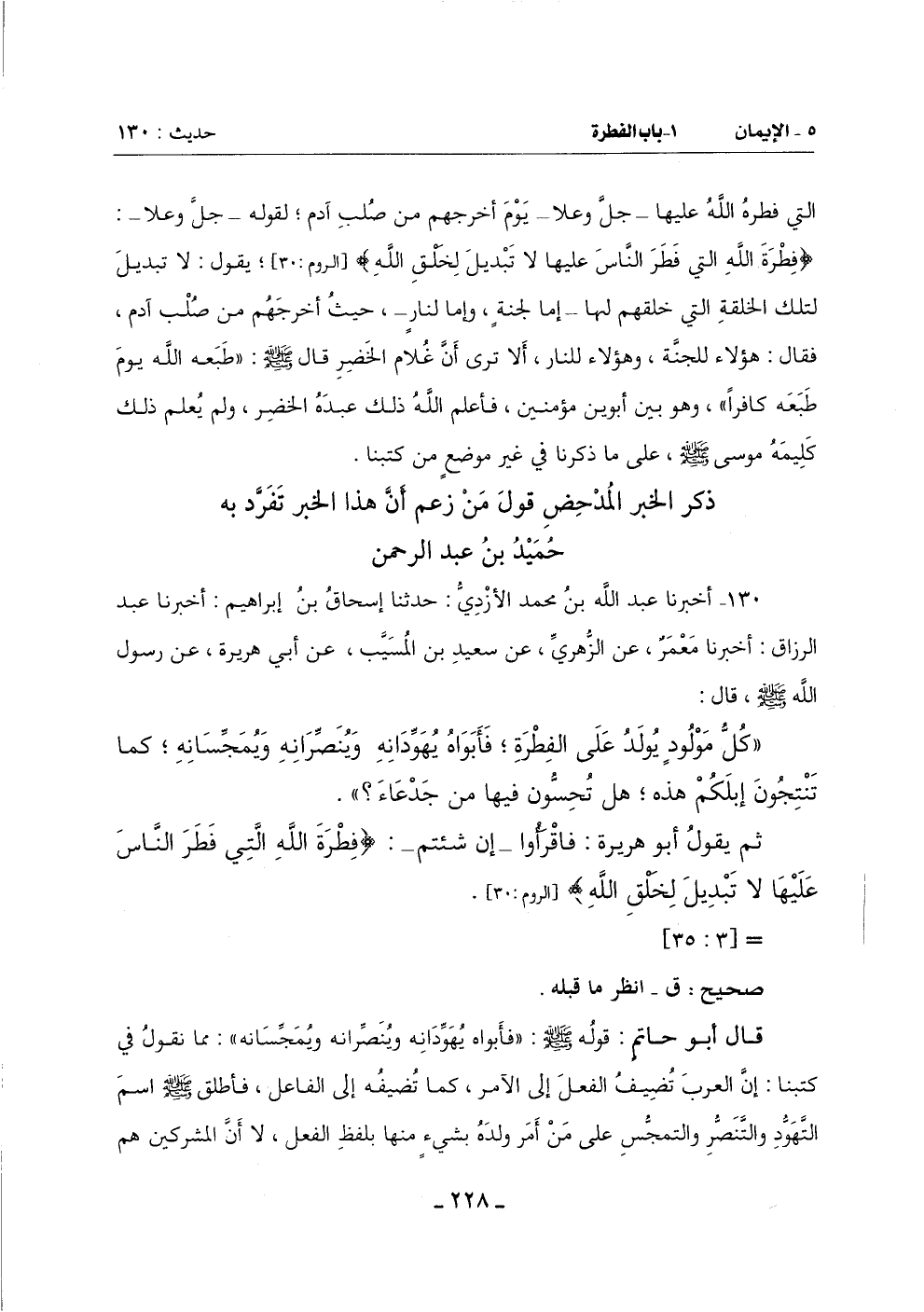قَالَ أَبُو حَاتِمٍ: قَوْلُهُ صَلَّى اللَّهُ عَلَيْهِ وَسَلَّمَ: (فَأَبَوَاهُ يُهَوِّدَانِهِ وَيُنَصِّرَانِهِ وَيُمَجِّسَانِهِ) مِمَّا نَقُولُ فِي كُتُبِنَا: إِنَّ الْعَرَبَ تُضِيفُ الْفِعْلَ إِلَى الْآمِرِ كَمَا تُضِيفُهُ إلى الفاعل قأطلق صَلَّى اللَّهُ عَلَيْهِ وَسَلَّمَ اسْمَ التَّهَوُّدِ وَالتَّنَصُّرِ وَالتَّمَجُّسِ عَلَى مَنْ أَمَرَ وَلَدَهُ بِشَيْءٍ مِنْهَا بِلَفْظِ الْفِعْلِ لَا أَنَّ الْمُشْرِكِينَ هُمُ -[229]- الَّذِينَ يُهَوِّدُونَ أَوْلَادَهُمْ أَوْ يُنَصِّرُونَهُمْ أَوْ يُمَجِّسُونَهُمْ دُونَ قَضَاءِ اللَّهِ عَزَّ وَجَلَّ فِي سَابِقِ عِلْمِهِ فِي عَبِيدِهِ عَلَى حَسَبِ مَا ذَكَرْنَاهُ فِي غَيْرِ مَوْضِعٍ مِنْ كُتُبِنَا.