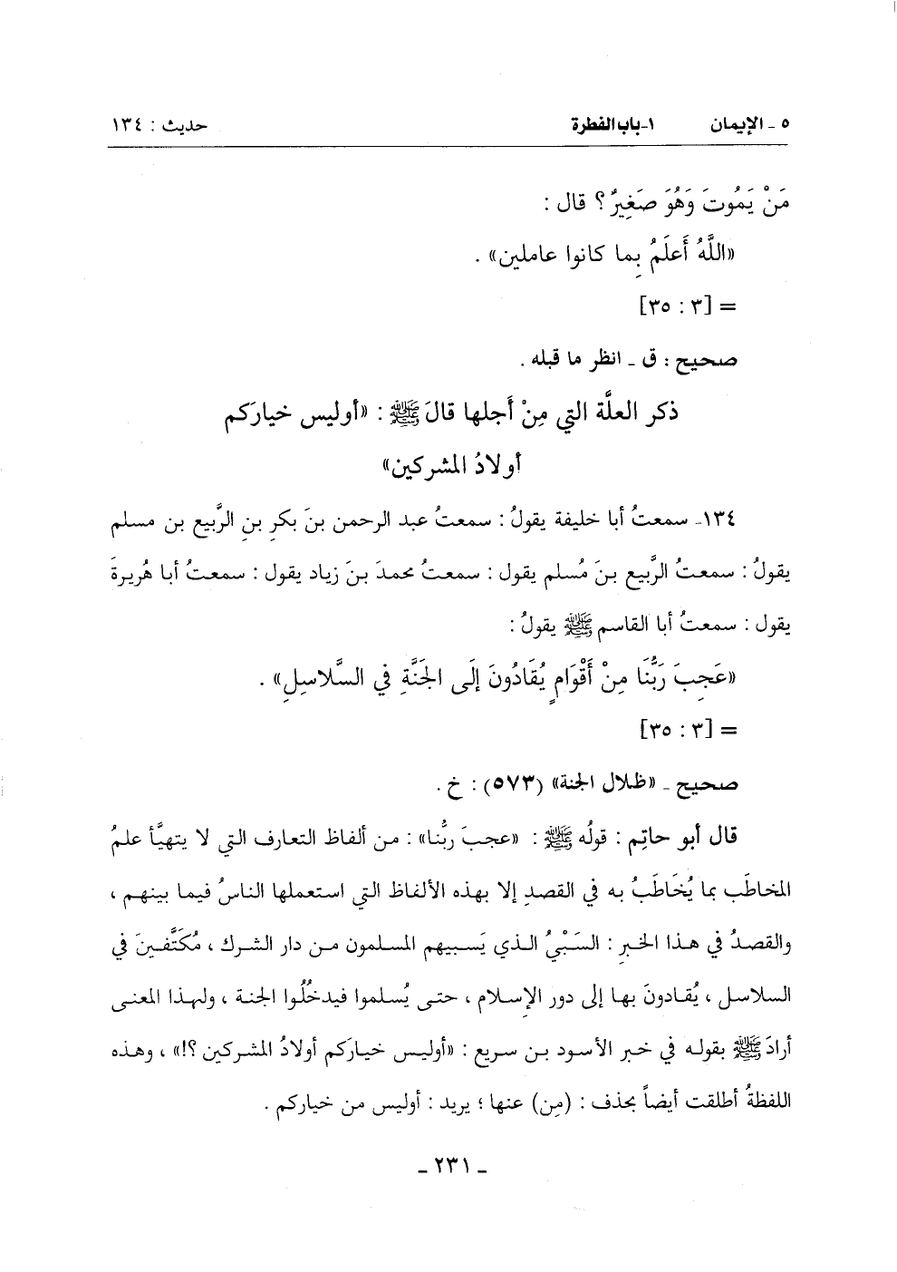قَالَ أَبُو حَاتِمٍ: قَوْلُهُ صَلَّى اللَّهُ عَلَيْهِ وَسَلَّمَ (عَجِبَ ربُّنا) مِنْ أَلْفَاظِ التَّعَارُفِ الَّتِي لَا يَتَهَيَّأُ عِلْمُ الْمُخَاطَبِ بِمَا يُخَاطَبُ بِهِ فِي الْقَصْدِ إِلَّا بِهَذِهِ الْأَلْفَاظِ الَّتِي اسْتَعْمَلَهَا النَّاسُ فِيمَا بَيْنَهُمْ وَالْقَصْدُ فِي هَذَا الْخَبَرِ السبي الذي يسبيهم المسلمون من دارالشرك مُكَتَّفِينَ فِي السَّلَاسِلِ يُقَادُونَ بِهَا إِلَى دُورِ الْإِسْلَامِ حَتَّى يُسْلِمُوا فَيَدْخُلُوا الْجَنَّةَ وَلِهَذَا الْمَعْنَى أَرَادَ صَلَّى اللَّهُ عَلَيْهِ وَسَلَّمَ بِقَوْلِهِ فِي خبر الأسود بن سريع: (أوليس خِيَارَكُمْ أَوْلَادُ الْمُشْرِكِينَ) وَهَذِهِ اللَّفْظَةُ أُطْلِقَتْ أَيْضًا بحذف (من) عنها يريد: أوليس من خياركم