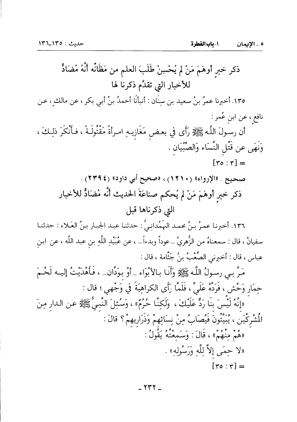 136 - أَخْبَرَنَا عُمَرُ بْنُ مُحَمَّدٍ الْهَمْدَانِيُّ حَدَّثَنَا عَبْدُ الْجَبَّارِ بْنُ الْعَلَاءِ حَدَّثَنَا سُفْيَانُ قَالَ: سَمِعْنَاهُ مِنِ الزُّهْرِيِّ ـ عَودًا وَبَدْءًا ـ عَنْ عُبَيْدِ اللَّهِ بْنِ عَبْدِ اللَّهِ عَنِ ابْنِ عَبَّاسٍ قَالَ: أَخْبَرَنِي الصَّعْبُ بْنُ جَثَّامَةَ قَالَ: