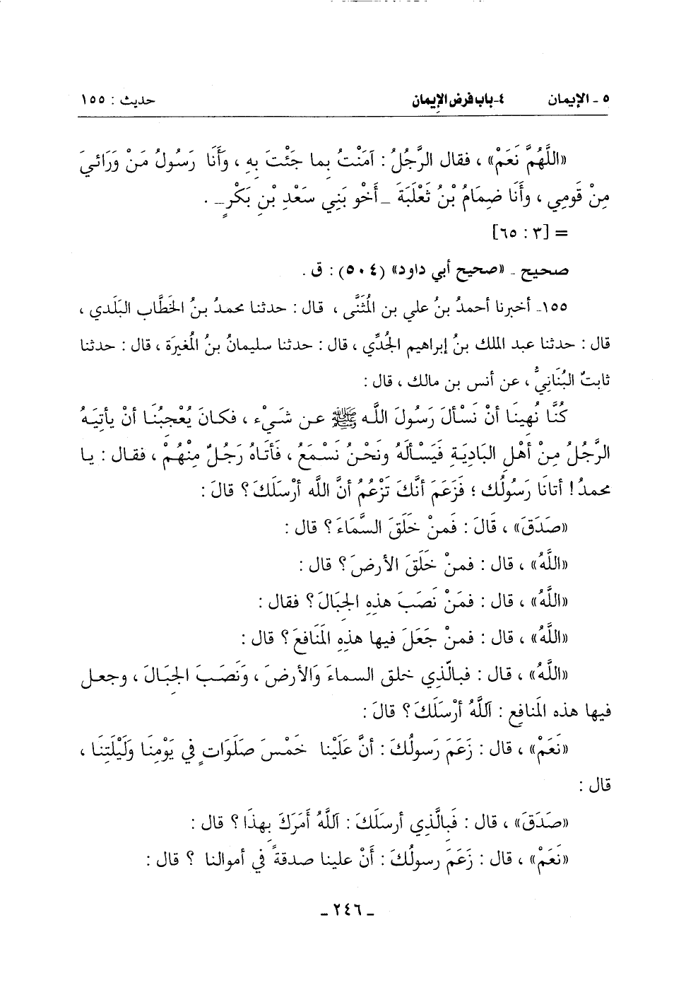 (نَعَمْ) قَالَ: زَعَمَ رَسُولُكَ أَنَّ عَلَيْنَا صَدَقَةً فِي أَمْوَالِنَا قَالَ: -[247]-