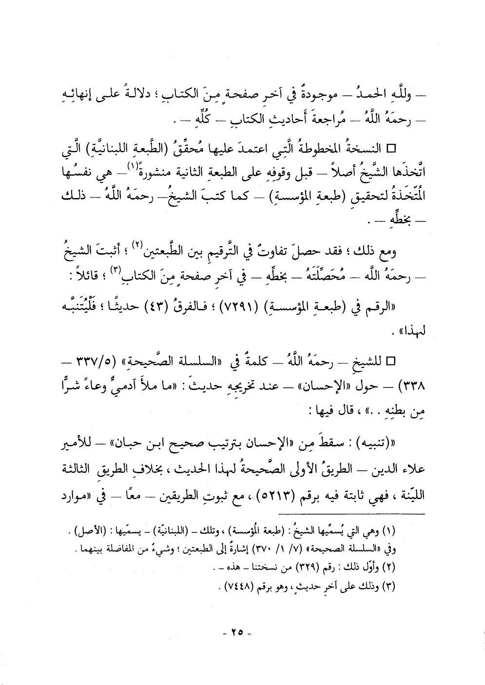 ولله الحمد ـ موجودة في آخر صفحة من الكتاب؛ دلالة على إنهائه ـ رحمه الله ـ مراجعة أحاديث الكتاب ـ كله ـ.