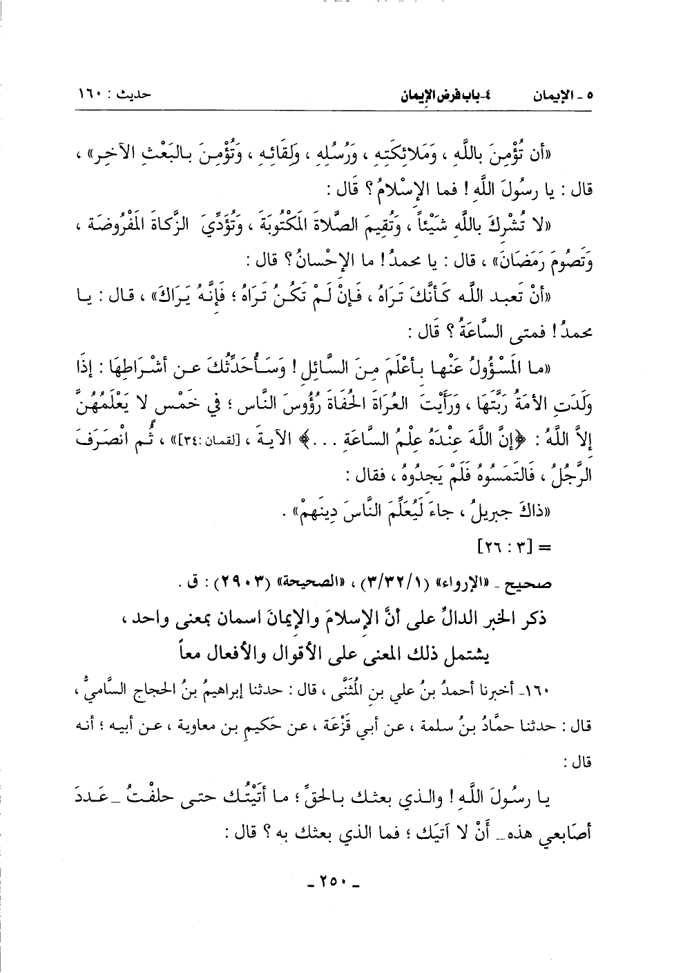 ذِكْرُ الْخَبَرِ الدَّالِّ عَلَى أَنَّ الْإِسْلَامَ وَالْإِيمَانَ اسْمَانِ بِمَعْنًى وَاحِدٍ يَشْتَمِلُ ذَلِكَ الْمَعْنَى عَلَى الْأَقْوَالِ وَالْأَفْعَالِ مَعًا