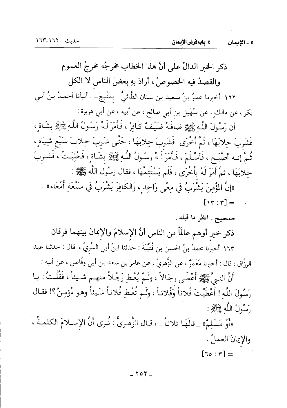 (أَوْ مَسْلِمُ) ـ قَالَهَا ثَلَاثًا ـ: قَالَ الزُّهْرِيُّ نَرَى أَنَّ الْإِسْلَامَ الكلمة والإيمان العمل