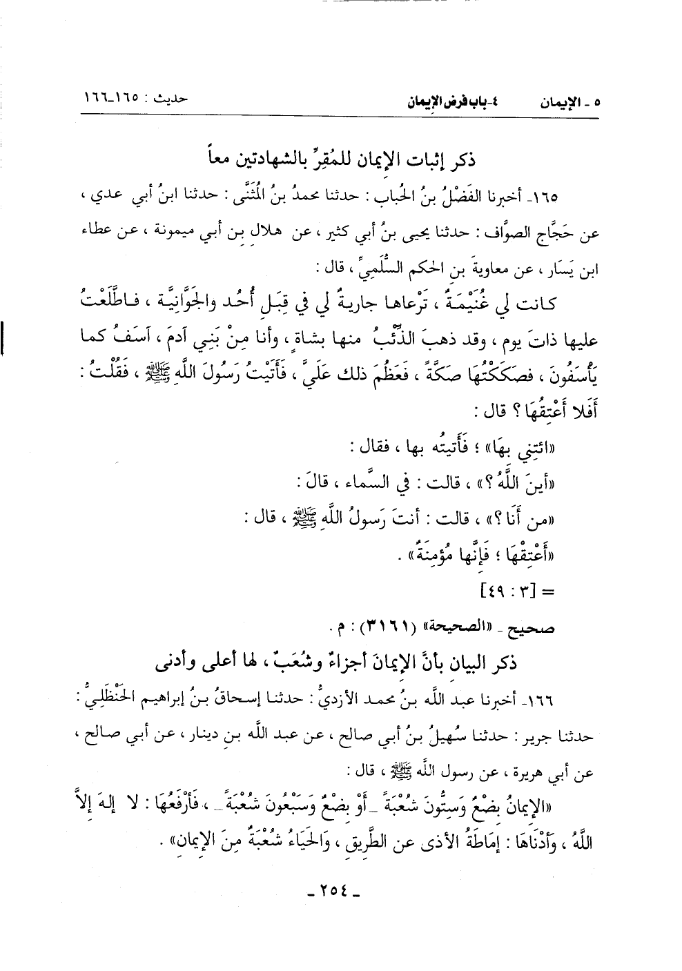 (الْإِيمَانُ بضعٌ وَسِتُّونَ شُعبة ـ أَوْ بِضعٌ وَسَبْعُونَ شُعْبَةً ـ فَأرْفَعُهَا لَا إِلَهَ إِلَّا اللَّهُ وَأَدْنَاهَا إِمَاطَةُ الْأَذَى عَنِ الطَّرِيقِ وَالْحَيَاءُ شعبة من الإيمان) -[255]-