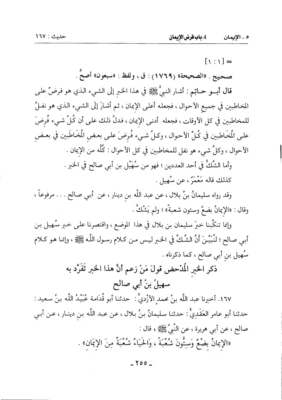 قَالَ أَبُو حَاتِمٍ: اخْتَصَرَ سُلَيْمَانُ بْنُ بِلَالٍ هَذَا الْخَبَرَ فَلَمْ يَذْكُرْ ذِكْرَ الْأَعْلَى وَالْأَدْنَى مِنَ الشُّعب وَاقْتَصَرَ عَلَى ذِكْرِ السِّتِّينَ دُونَ السَّبْعِينَ وَالْخَبَرُ فِي بِضْعٍ وَسَبْعِينَ خَبَرٌ متقصَّى صَحِيحٌ لَا ارْتِيَابَ فِي ثُبُوتِهِ وَخَبَرُ سُلَيْمَانَ بْنِ بِلَالٍ خَبَرٌ مُخْتَصَرٌ غَيْرُ مُتَقَصًّى.