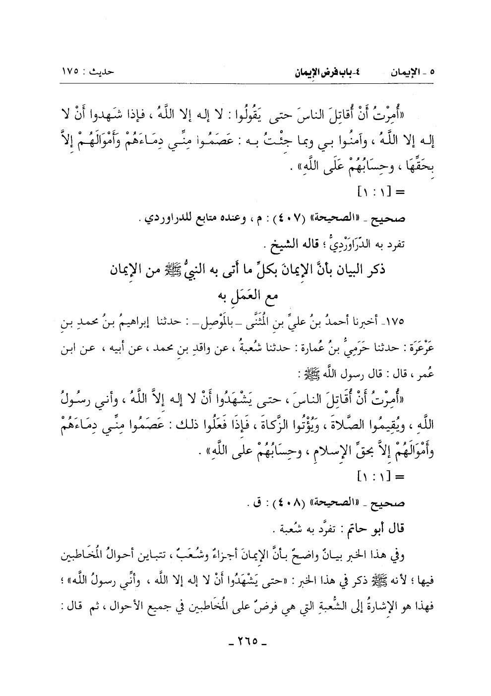 (أُمرت أَنْ أُقَاتِلَ النَّاسَ حَتَّى يَشْهَدُوا أَنْ لَا إِلَهَ إِلَّا اللَّهُ وَأَنِّي رَسُولُ اللَّهِ وَيُقِيمُوا الصَّلَاةَ وَيُؤْتُوا الزَّكَاةَ فَإِذَا فَعَلُوا ذَلِكَ عَصَمُوا مِنِّي دِمَاءَهُمْ وَأَمْوَالَهُمْ إِلَّا بحق الإسلام وحسابهم على الله)