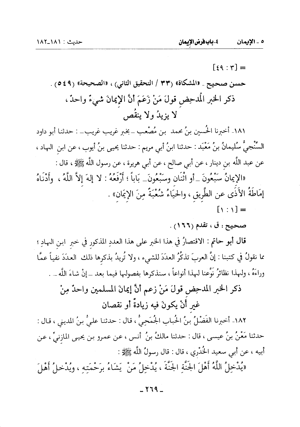 ذكر الخبر المدحض قول من زعم أن إِيمَانَ الْمُسْلِمِينَ وَاحِدٌ مِنْ غَيْرِ أَنْ يَكُونَ فِيهِ زِيَادَةٌ أَوْ نُقْصَانٌ
