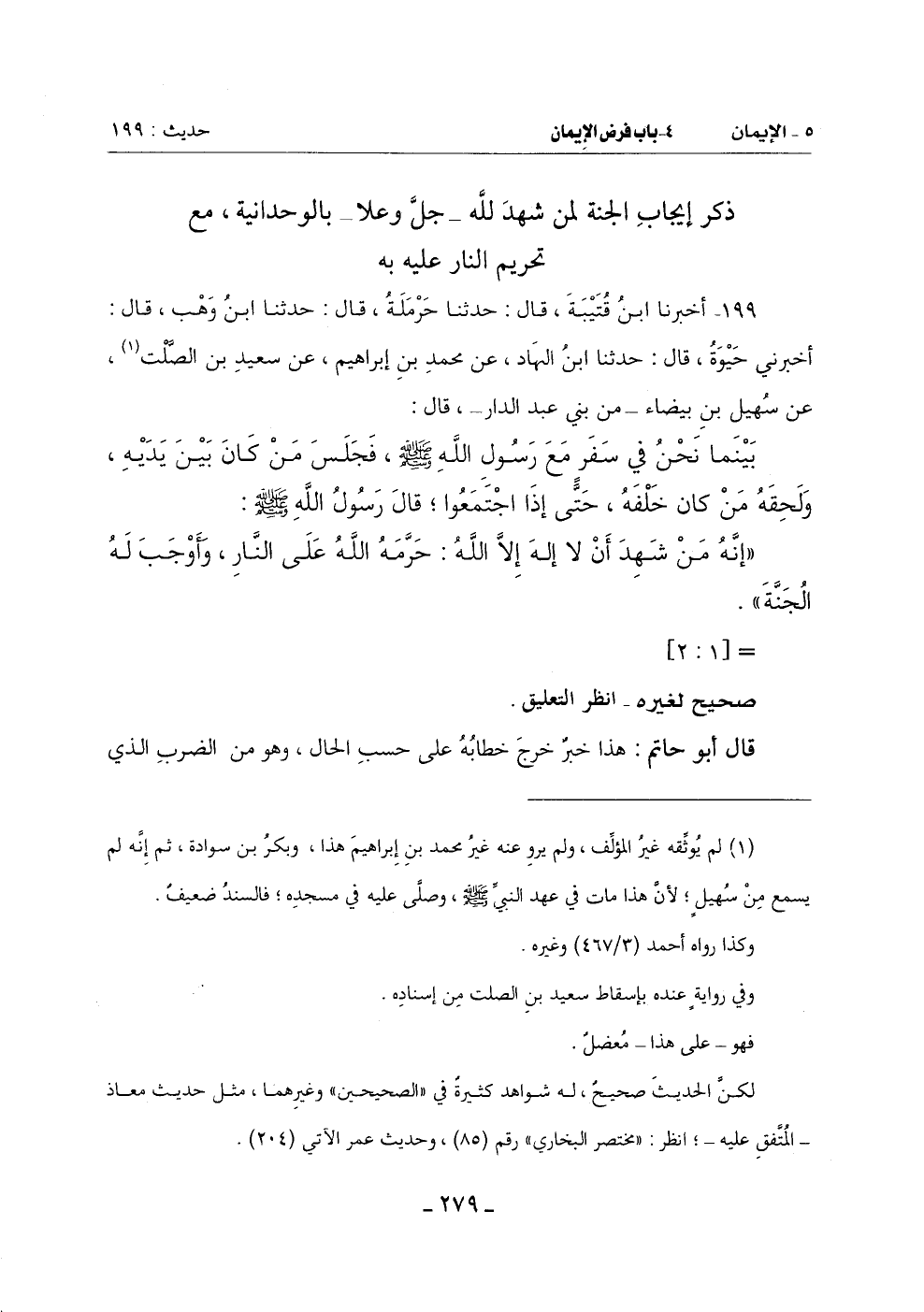 لكنّ الحديث صحيحٌ له شواهد كثيرة في ((الصحيحين)) وغيرهما , مثل حديث معاذ ـ المُتفقِ عليه ـ؛ انظر: ((مختصر البخاري)) رقم (85)، وحديث عمر الآتي (204).