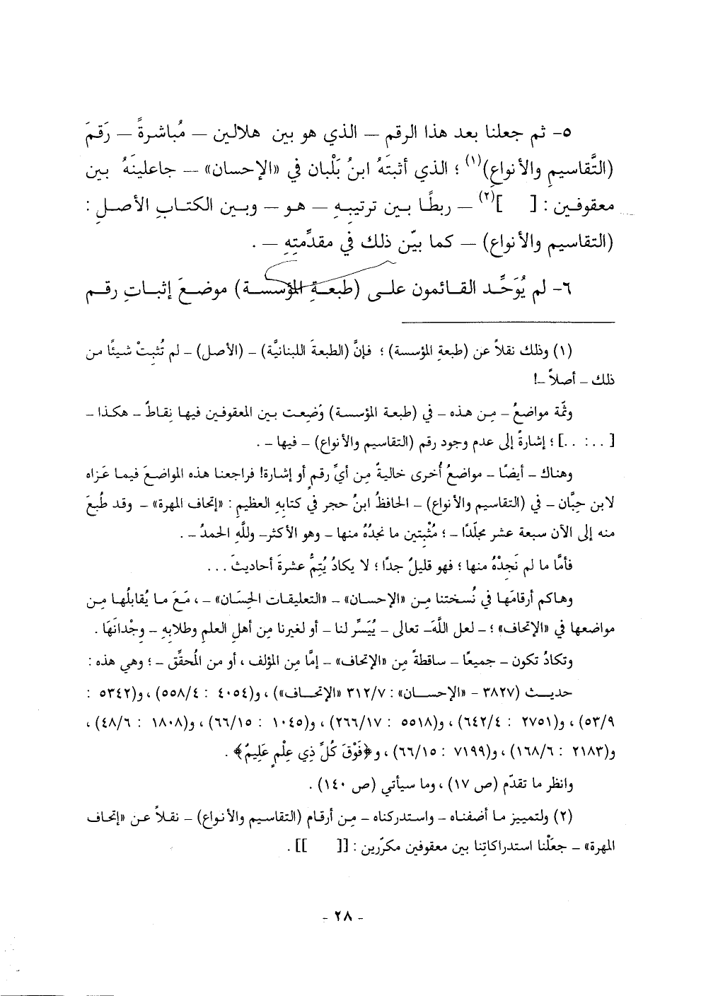 5 ـ ثم جعلنا بعد هذا الرقم ـ الذي هو بين هلالين ـ مباشرة ـ رقم (التقاسيم والأنواع) (1)؛ الذي أثبته ابن بلبان في ((الإحسان)) ـ جاعلينه بين معقوفين: [] (2) ـ ربطا بين ترتيبه ـ هو ـ وبين الكتاب الأصل: (التقاسيم والأنواع) ـ كما بين ذلك في مقدمته ـ.