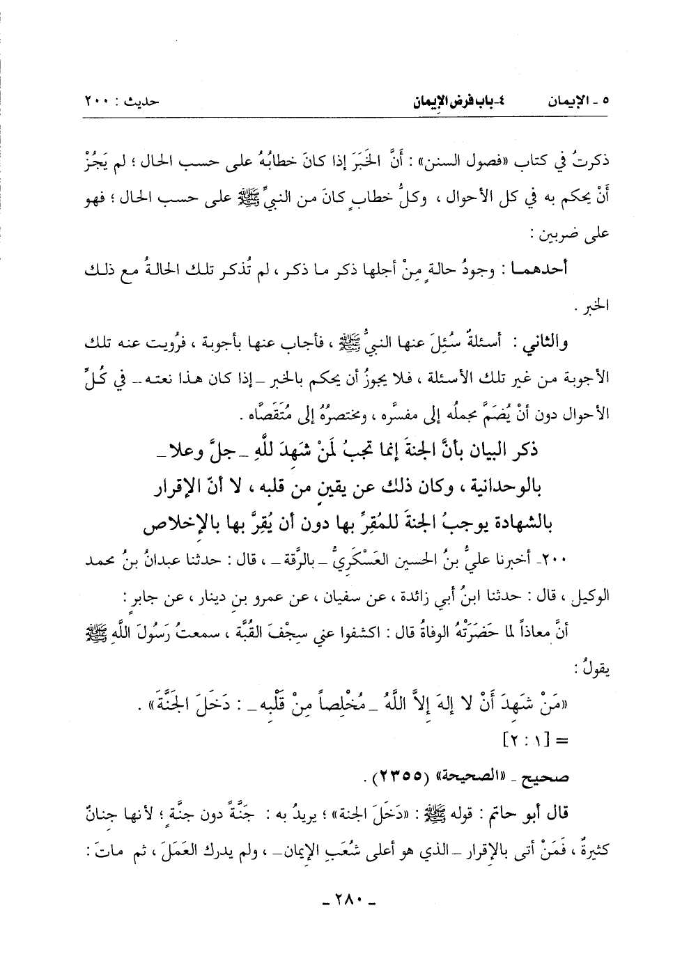قَالَ أَبُو حَاتِمٍ: قَوْلُهُ صَلَّى اللَّهُ عَلَيْهِ وَسَلَّمَ: (دَخَلَ الْجَنَّةَ) يُرِيدُ بِهِ جَنَّةً دُونَ جُنَّةٍ لِأَنَّهَا جِنَانٌ كَثِيرَةٌ فَمَنْ أَتَى بِالْإِقْرَارِ الَّذِي هُوَ أَعْلَى شُعَبِ الْإِيمَانِ وَلَمْ يُدْرِكِ الْعَمَلَ ثُمَّ مَاتَ -[281]- أُدْخِلَ الْجَنَّةَ وَمَنْ أَتَى بَعْدَ الْإِقْرَارِ مِنَ الْأَعْمَالِ قَلَّ أَوْ كَثُرَ أُدْخِلَ الْجَنَّةَ جَنَّةً فَوْقَ تِلْكَ الْجَنَّةِ لِأَنَّ مَنْ كَثُرَ عَمَلُهُ عَلَتْ دَرَجَاتُهُ وَارْتَفَعَتْ جَنَّتُهُ لَا أَنَّ الْكُلَّ مِنَ الْمُسْلِمِينَ يَدْخُلُونَ جَنَّةً وَاحِدَةً وَإِنْ تَفَاوَتَتْ أَعْمَالُهُمْ وَتَبَايَنَتْ لِأَنَّهَا جِنَانٌ كَثِيرَةٌ لَا جَنَّةٌ وَاحِدَةٌ