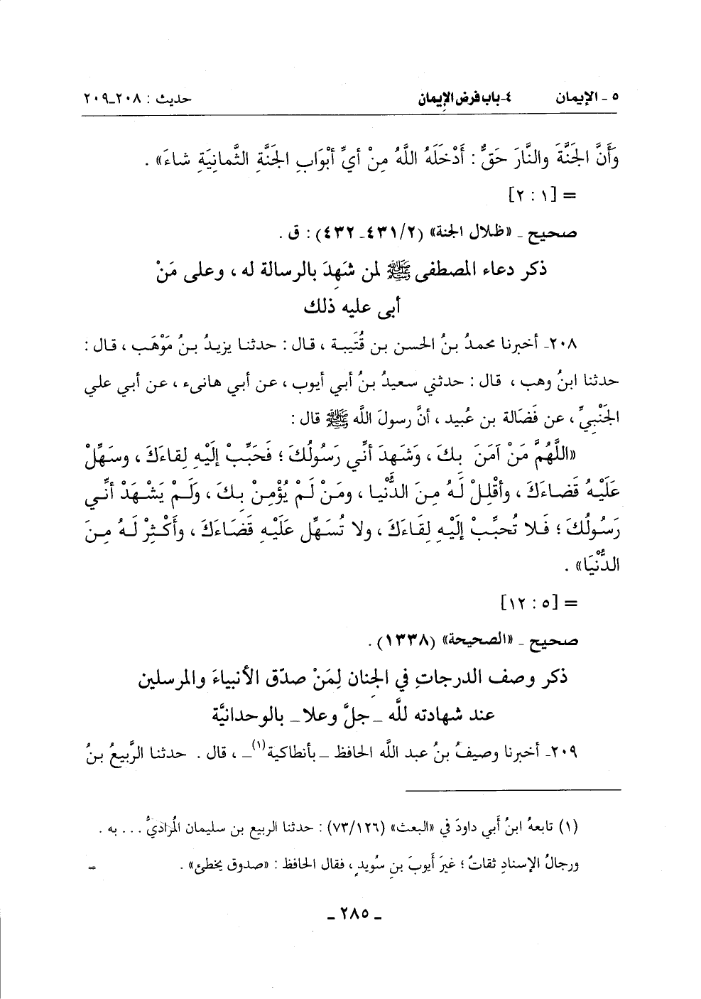 209 - أَخْبَرَنَا وَصِيفُ بْنُ عَبْدِ اللَّهِ الْحَافِظُ ـ بِأَنْطَاكِيَةَ (¬1) ـ قَالَ: حَدَّثَنَا الرَّبِيعُ بْنُ -[286]- سُلَيْمَانَ قَالَ: حَدَّثَنَا أَيُّوبُ بْنُ سُوَيْدٍ قَالَ: حَدَّثَنَا مَالِكٌ عَنْ أَبِي حَازِمٍ عَنْ سَهْلِ بْنِ سَعْدٍ قَالَ: قَالَ رَسُولُ اللَّهِ صَلَّى اللَّهُ عَلَيْهِ وَسَلَّمَ: