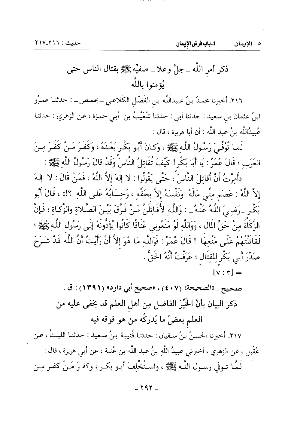 لَمَّا تُوُفِّيَ رَسُولُ اللَّهِ صَلَّى اللَّهُ عَلَيْهِ وَسَلَّمَ وَاسْتُخْلِفَ أبو بكر وَكَفَرَ مَنْ كَفَرَ مِنَ -[293]- الْعَرَبِ قَالَ عُمَرُ رَضِيَ اللَّهُ عَنْهُ لِأَبِي بَكْرٍ: كَيْفَ تُقَاتِلُ النَّاسَ وَقَدْ قَالَ رَسُولُ اللَّهِ صَلَّى اللَّهُ عَلَيْهِ وَسَلَّمَ:
