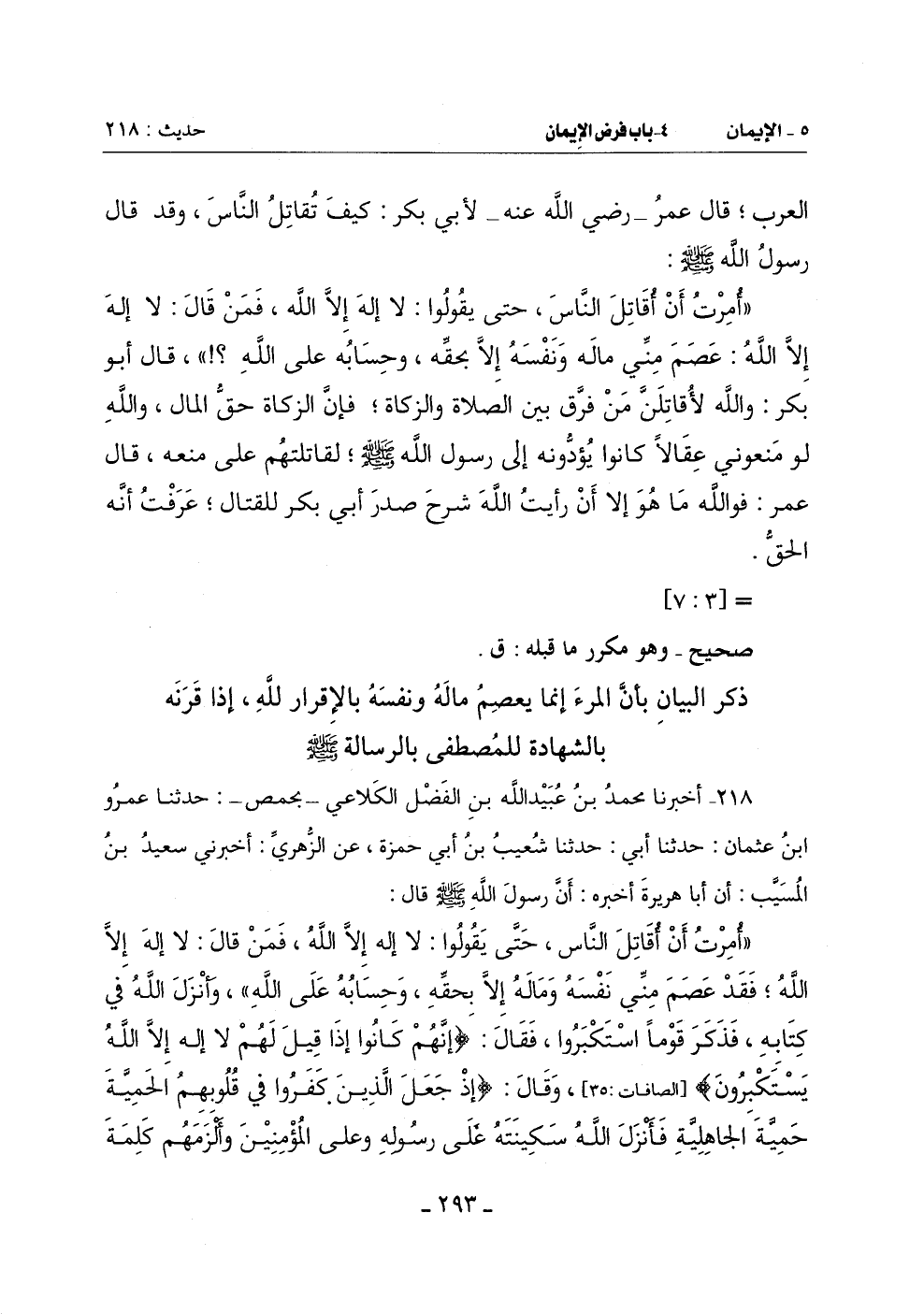 (أُمرت أَنْ أُقاتل النَّاسَ حَتَّى يَقُولُوا: لَا إِلَهَ إِلَّا اللَّهُ فَمَنْ قَالَ: لَا إِلَهَ إِلَّا اللَّهُ فَقَدْ عَصَمَ مِنِّي نَفْسَهُ وَمَالَهُ إِلَّا بِحَقِّهِ وَحِسَابُهُ عَلَى اللَّهِ وَأَنْزَلَ اللَّهُ فِي كِتَابِهِ فَذَكَرَ قَوْمًا اسْتَكْبَرُوا فَقَالَ {إِنَّهُمْ كَانُوا إِذَا قِيلَ لَهُمْ لَا إِلَهَ إِلَّا اللَّهُ يَسْتَكْبِرُونَ} [الصافات: 35] وَقَالَ: {إِذْ جَعَلَ الَّذِينَ كَفَرُوا فِي قُلُوبِهِمُ الْحَمِيَّةَ حَمِيَّةَ الْجَاهِلِيَّةِ فَأَنْزَلَ اللَّهُ سَكِينَتَهُ عَلَى رَسُولِهِ وَعَلَى الْمُؤْمِنِينَ وَأَلْزَمَهُمْ كَلِمَةَ -[294]- التَّقْوَى} [الفتح: 26] وَهِيَ لَا إِلَهَ إِلَّا اللَّهُ وَمُحَمَّدٌ رَسُولُ اللَّهِ , استكبر عنها المشركون يوم الحديبية