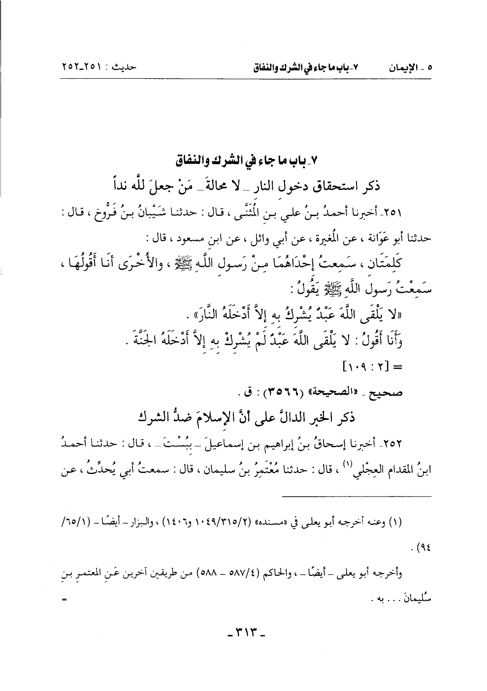 ((لَا يَلْقَى اللَّهَ عَبْدٌ يُشْرِكُ بِهِ إِلَّا أَدْخَلَهُ النَّارَ))