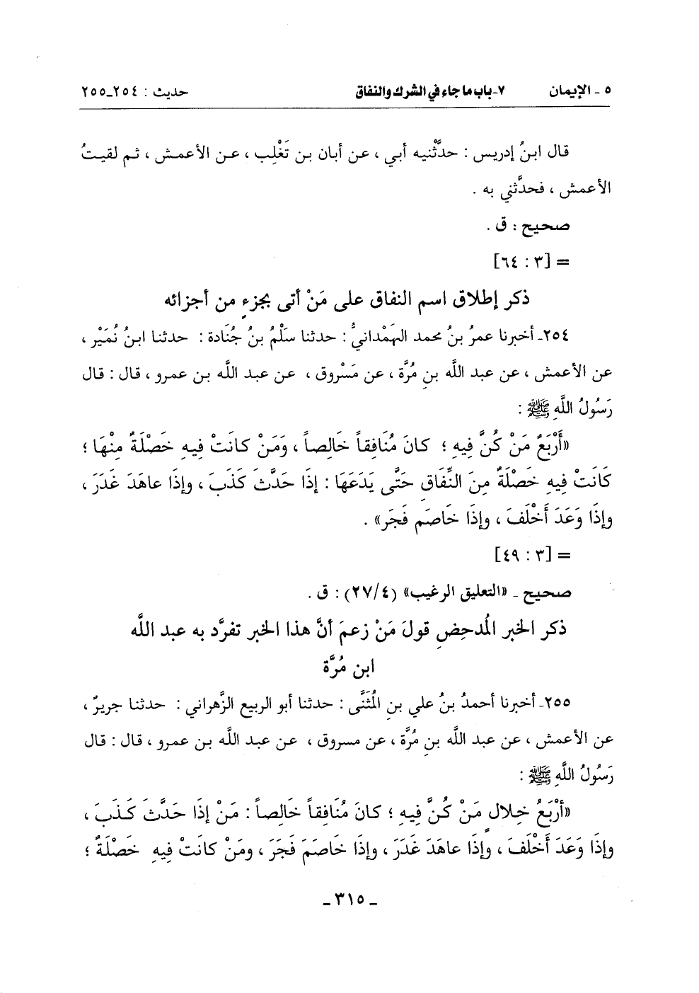 (أربعُ خلالٍ مَنْ كُنَّ فِيهِ كَانَ مُنَافِقًا خَالِصًا: مَنْ إِذَا حَدَّثَ كَذَبَ وَإِذَا وَعَدَ أَخْلَفَ وَإِذَا عَاهَدَ غَدَرَ وَإِذَا خَاصَمَ فَجَرَ وَمَنْ كَانَتْ فِيهِ خَصْلَةٌ -[316]- مِنْهُنَّ كَانَتْ فِيهِ خَصْلَةٌ من النفاق)