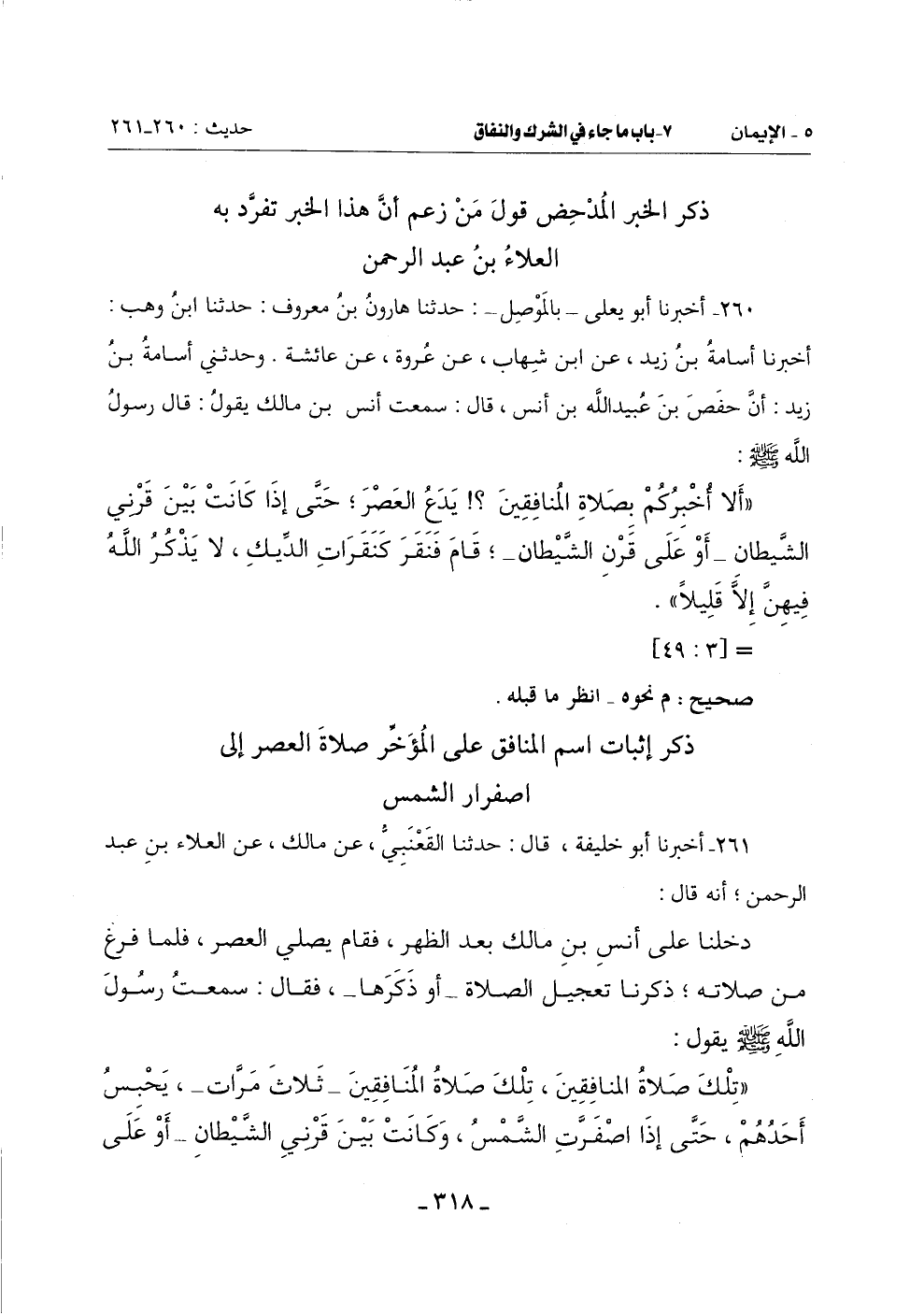 (تلك صلاة المنافقين تلك صلاة المناققين - ثَلَاثَ مَرَّاتٍ - يَجْلِسُ أَحَدُهُمْ حَتَّى إِذَا اصْفَرَّتِ الشَّمْسُ وَكَانَتْ بَيْنَ قَرْنَيِ الشَّيْطَانِ أَوْ عَلَى -[319]- قرني الشيطان قام أَرْبَعًا لَمْ يَذْكُرِ اللَّهَ فِيهَا إِلَّا قَلِيلًا)