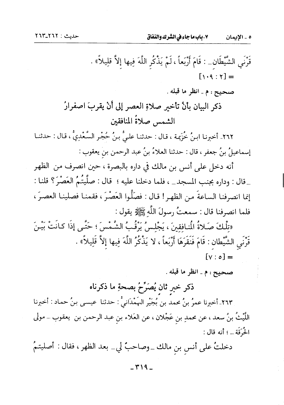 262 - أَخْبَرَنَا ابْنُ خُزَيْمَةَ قَالَ: حَدَّثَنَا عَلِيُّ بْنُ حُجْرٍ السَّعْدِيُّ قَالَ: حَدَّثَنَا إِسْمَاعِيلُ بْنُ جَعْفَرٍ قَالَ: حَدَّثَنَا الْعَلَاءُ بْنُ عَبْدِ الرَّحْمَنِ بْنِ يَعْقُوبَ: