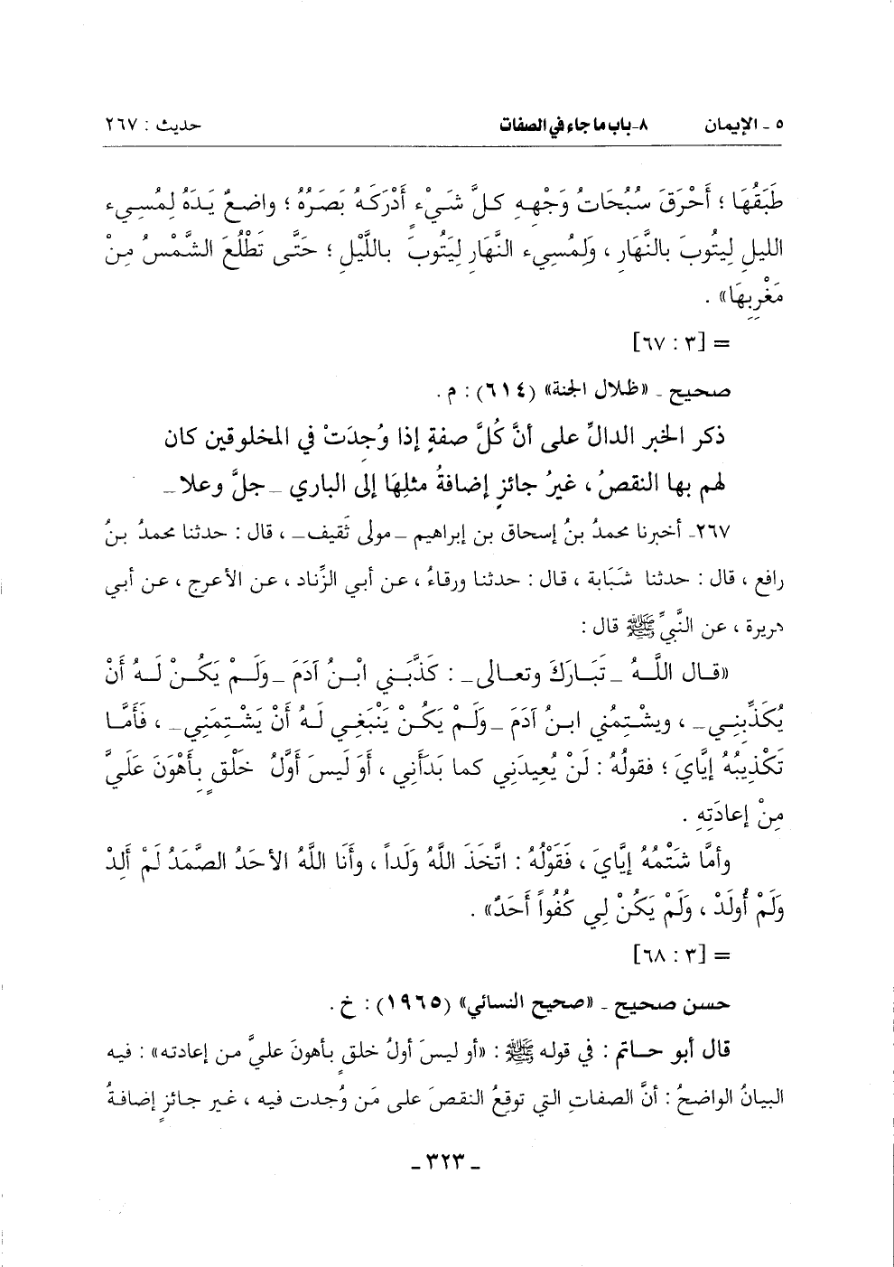 ذِكْرُ الْخَبَرِ الدَّالِّ عَلَى أَنَّ كُلَّ صِفَةٍ إِذَا وُجِدَتْ فِي الْمَخْلُوقِينَ كَانَ لَهُمْ بِهَا النَّقْصُ غَيْرُ جَائِزٍ إِضَافَةُ مِثْلِهَا إِلَى الْبَارِي جل وعلا