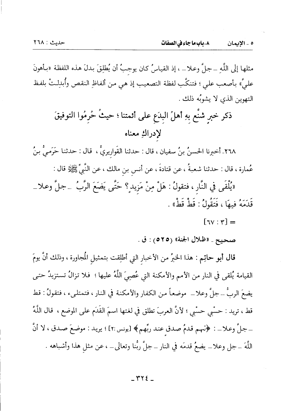 قَالَ أَبُو حَاتِمٍ: هَذَا الْخَبَرُ مِنَ الْأَخْبَارِ الَّتِي أُطْلِقَتْ بِتَمْثِيلِ الْمُجَاوَرَةِ وَذَلِكَ أَنَّ يَوْمَ الْقِيَامَةِ يُلقى فِي النَّارِ مِنَ الْأُمَمِ وَالْأَمْكِنَةِ الَّتِي عُصي اللَّهُ عَلَيْهَا فَلَا تَزَالُ تَسْتَزِيدُ حَتَّى يَضَعَ الرَّبُّ جَلَّ وَعَلَا مَوْضِعًا مِنَ الكفار والأمكنة في النار فتمتلىء فَتَقُولُ: قَطْ قَطْ تُرِيدُ: حَسْبِي حَسْبِي لِأَنَّ الْعَرَبَ تُطْلِقُ فِي لُغَتِهَا اسْمَ الْقَدَمِ عَلَى الْمَوْضِعِ قَالَ اللَّهُ جَلَّ وَعَلَا: {لَهُمْ قدمُ صدقٍ عِنْدَ رَبِّهِمْ} [يونس: 2] يُرِيدُ: مَوْضِعَ صِدْقٍ لَا أَنَّ اللَّهَ جَلَّ وَعَلَا يَضَعُ قَدَمَهُ فِي النَّارِ جَلَّ رَبُّنَا وَتَعَالَى عَنْ مِثْلِ هذا وأشباهه