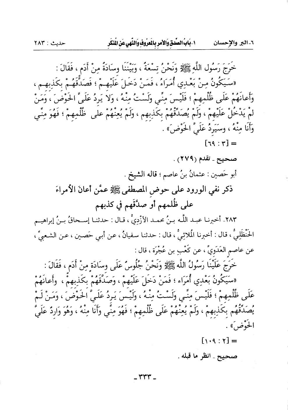 (سَيَكُونُ بَعْدِي أُمَرَاءُ فَمَنْ دَخَلَ عَلَيْهِمْ وصدَّقهم بِكَذِبِهِمْ وَأَعَانَهُمْ عَلَى ظُلْمِهِمْ فَلَيْسَ مِنِّي وَلَسْتُ مِنْهُ وَلَيْسَ يَرِدُ عَلَيَّ الْحَوْضَ وَمَنْ لَمْ يُصدِّقهم بِكَذِبِهِمْ وَلَمْ يُعنهُم عَلَى ظُلْمِهِمْ فَهُوَ مِنِّي وَأَنَا مِنْهُ وَهُوَ وَارِدٌ علي الحوض)