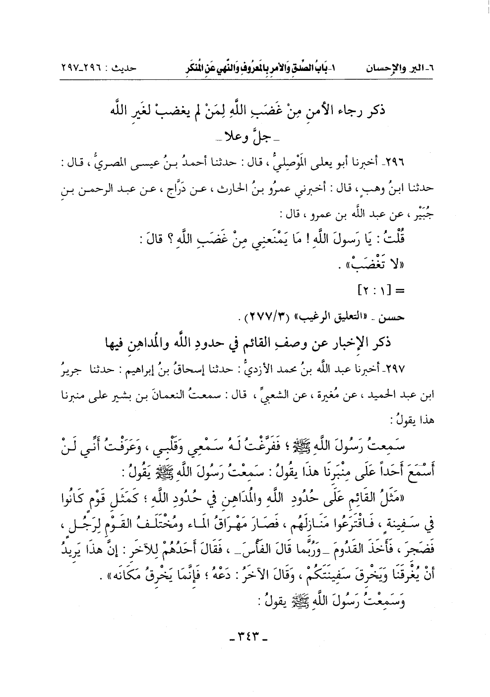 296 - أَخْبَرَنَا أَبُو يَعْلَى الْمَوْصِلِيُّ قَالَ: حَدَّثَنَا أَحْمَدُ بْنُ عِيسَى الْمِصْرِيُّ قَالَ: حَدَّثَنَا ابْنُ وَهْبٍ قَالَ: أَخْبَرَنِي عَمْرُو بْنُ الْحَارِثِ عَنْ درَّاج عَنْ عَبْدِ الرَّحْمَنِ بْنِ جُبَيْرٍ عَنْ عَبْدِ اللَّهِ بْنِ عَمْرٍو قَالَ: