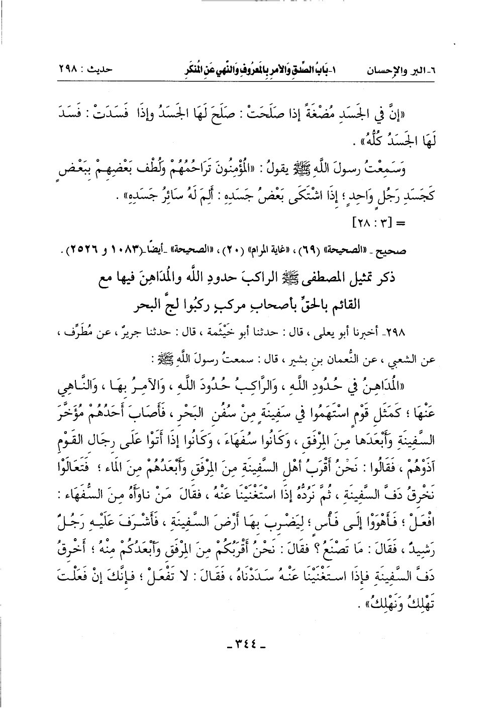 (الْمُدَاهِنُ فِي حُدُودِ اللَّهِ وَالرَّاكِبُ حُدُودَ اللَّهِ وَالْآمِرُ بِهَا وَالنَّاهِي عَنْهَا كَمَثَلِ قَوْمٍ اسْتَهَمُوا فِي سَفِينَةٍ مِنْ سُفُنِ الْبَحْرِ فَأَصَابَ أَحَدُهُمْ مُؤَخَّرَ السَّفِينَةِ وَأَبْعَدَهَا مِنَ الْمِرْفَقِ وَكَانُوا سُفَهَاءَ وَكَانُوا إِذَا أَتَوْا عَلَى رِجَالِ الْقَوْمِ آذَوْهُمْ فَقَالُوا: نَحْنُ أَقْرَبُ أَهْلِ السَّفِينَةِ مِنَ الْمِرْفَقِ وَأَبْعَدُهُمْ مِنَ الْمَاءِ فَتَعَالَوْا نَخْرِقْ دَفَّ السَّفِينَةِ ثُمَّ نَرُدُّهُ إِذَا اسْتَغْنَيْنَا عَنْهُ فَقَالَ مَنْ ناوَأَهُ من السفهاء: افعل فأهووا إِلَى فَأْسٍ لِيَضْرِبَ بِهَا أَرْضَ السَّفِينَةِ فَأَشْرَفَ عَلَيْهِ رَجُلٌ رُشَيْدٌ فَقَالَ: مَا تَصْنَعُ؟ فَقَالَ: نَحْنُ أَقْرَبُكُمْ مِنَ المِرْفَقِ وَأَبْعَدُكُمْ مِنْهُ أَخْرِقُ دَفَّ السَّفِينَةِ فَإِذَا اسْتَغْنَيْنَا عَنْهُ سَدَدْنَاهُ فَقَالَ: لَا تَفْعَلْ فَإِنَّكَ إِنْ فَعَلْتَ تَهْلِكُ وَنَهْلِكُ) -[345]-