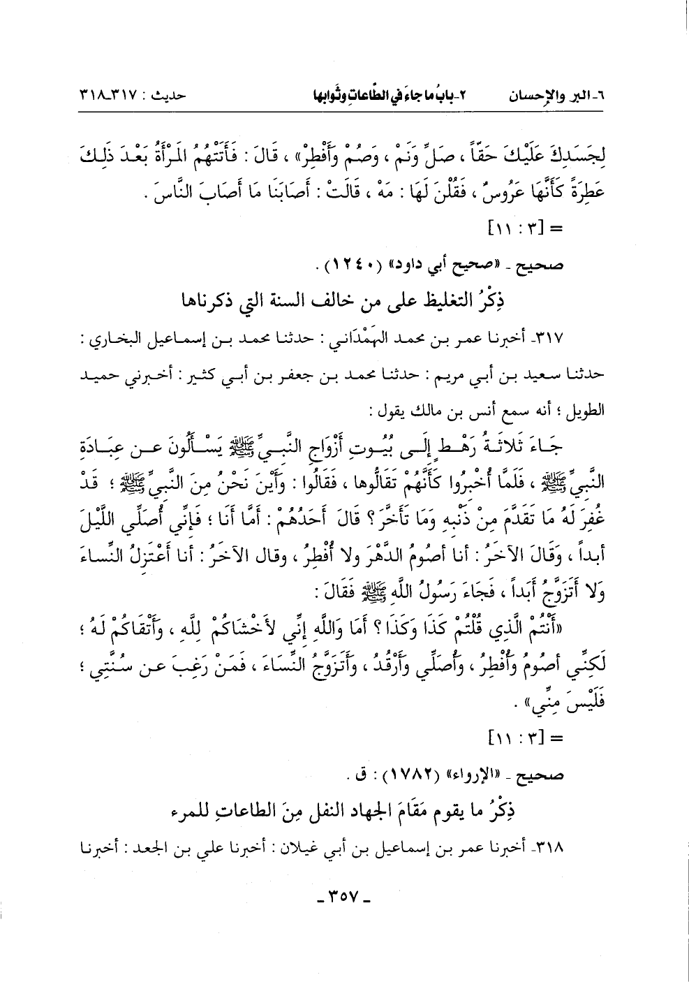 جَاءَ ثَلَاثَةُ رَهْطٍ إِلَى بُيُوتِ أَزْوَاجِ النَّبِيِّ صَلَّى اللَّهُ عَلَيْهِ وَسَلَّمَ يَسْأَلُونَ عَنْ عِبَادَةِ النَّبِيِّ صَلَّى اللَّهُ عَلَيْهِ وَسَلَّمَ فَلَمَّا أُخبروا كَأَنَّهُمْ تَقَالُّوها فَقَالُوا: وَأَيْنَ نَحْنُ مِنَ النَّبِيِّ صَلَّى اللَّهُ عَلَيْهِ وَسَلَّمَ قَدْ غُفِرَ لَهُ مَا تَقَدَّمَ مِنْ ذَنْبِهِ وَمَا تَأَخَّرَ؟! قَالَ أَحَدُهُمْ: أَمَّا أَنَا فَإِنِّي أُصلي اللَّيْلَ أَبَدًا وَقَالَ الْآخَرُ: أَنَا أَصُومُ الدَّهْرَ وَلَا أُفطر وَقَالَ الْآخَرُ: أَنَا أَعْتَزِلُ النِّسَاءَ وَلَا أَتَزَوَّجُ أَبَدًا فَجَاءَ رَسُولُ اللَّهِ صَلَّى اللَّهُ عَلَيْهِ وَسَلَّمَ فقَالَ:
