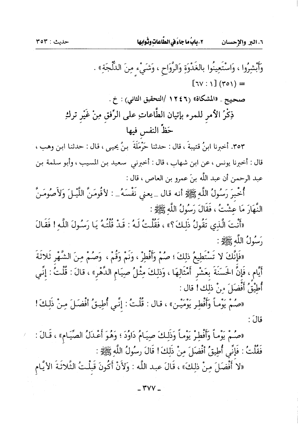 353 - أَخْبَرَنَا ابْنُ قُتَيْبَةَ قَالَ: حَدَّثَنَا حَرْمَلَةُ بْنُ يَحْيَى قَالَ: حَدَّثَنَا ابْنُ وَهْبٍ قَالَ: أَخْبَرَنَا يُونُسُ عَنِ ابْنِ شِهَابٍ قَالَ: أَخْبَرَنِي سَعِيدُ بْنُ الْمُسَيِّبِ وَأَبُو سَلَمَةَ بْنُ عَبْدِ الرَّحْمَنِ أَنَّ عَبْدَ اللَّهِ بْنَ عَمْرِو بْنِ الْعَاصِ قَالَ: