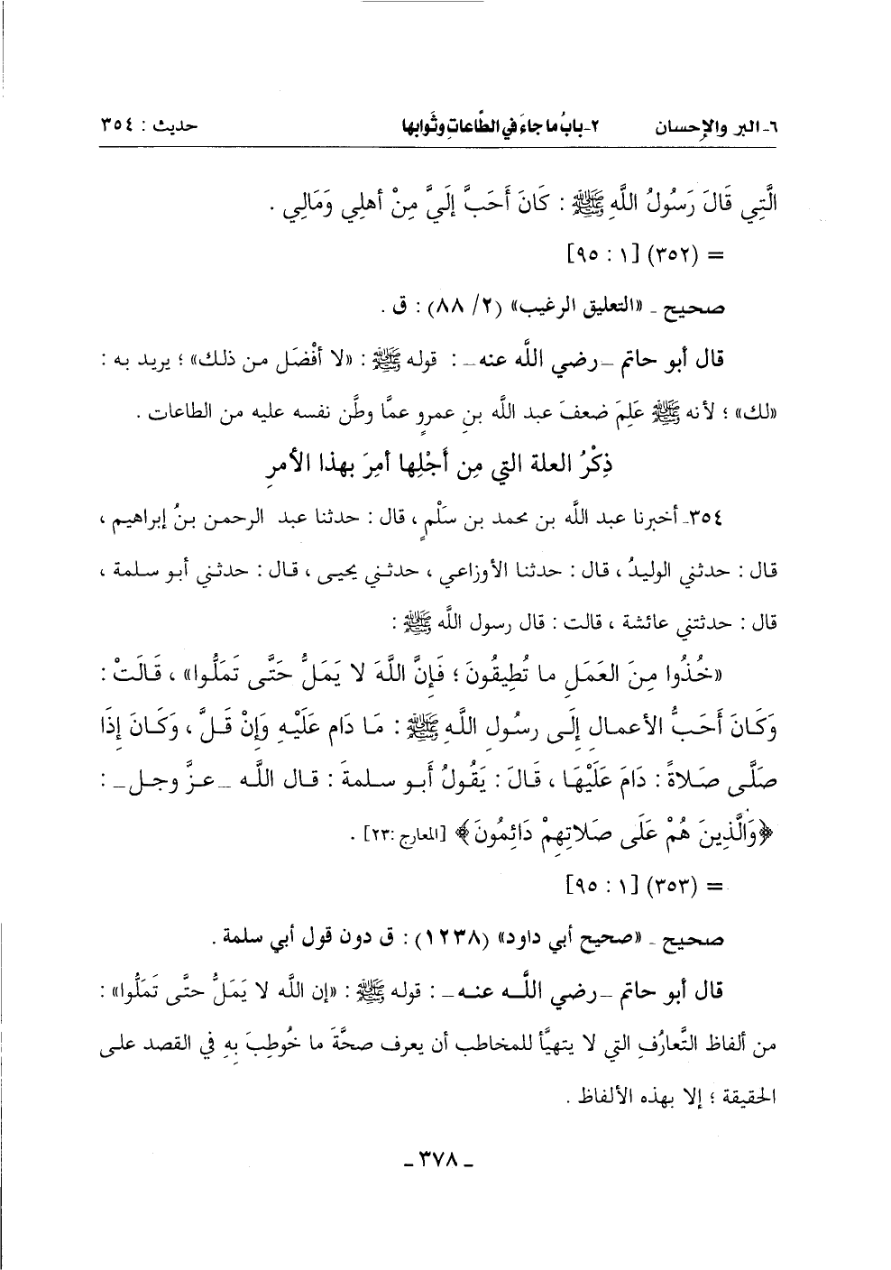 قَالَ أَبُو حَاتِمٍ رَضِيَ اللَّهُ عَنْهُ: قَوْلُهُ صَلَّى اللَّهُ عَلَيْهِ وَسَلَّمَ (إِنَّ اللَّهَ لَا يَمَلُّ حَتَّى تَمَلُّوا) مِنْ أَلْفَاظِ التَّعَارُفِ الَّتِي لَا يَتَهَيَّأُ لِلْمُخَاطَبِ أَنْ يَعْرِفَ صِحَّةَ مَا خُوطِبَ بِهِ فِي الْقَصْدِ عَلَى الْحَقِيقَةِ إِلَّا بهذه الألفاظ